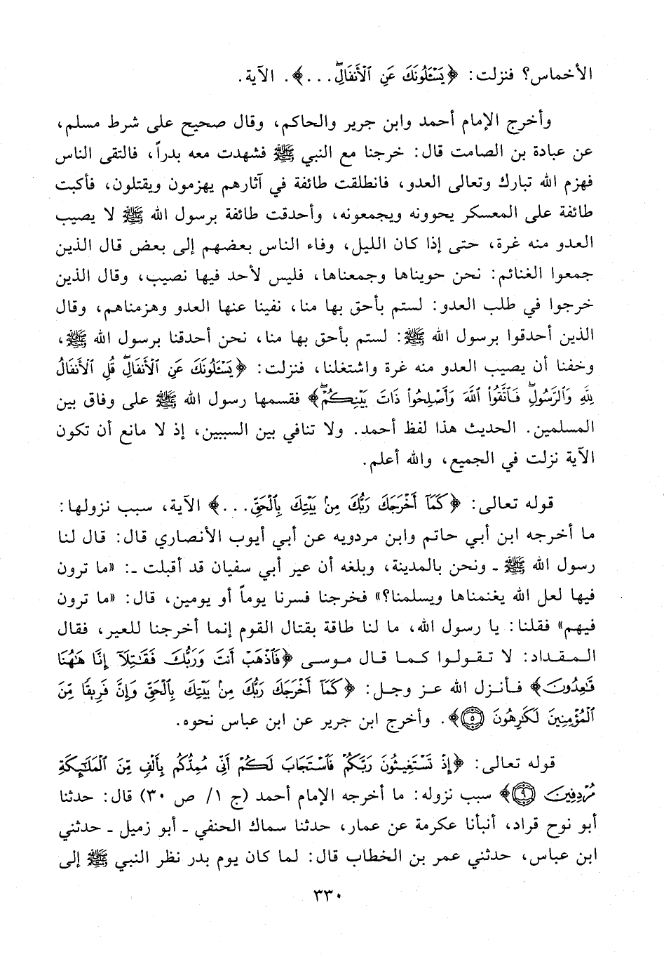 وأخرج الإمام أحمد وابن جرير والحاكم، وقال صحيح على شرط مسلم، عن عبادة بن الصامت قال: خرجنا مع النبي صلى الله عليه وسلّم فشهدت معه بدرا، فالتقى الناس فهزم الله تبارك وتعالى العدو، فانطلقت طائفة في آثارهم يهزمون ويقتلون، فأكبت طائفة على المعسكر يحوونه ويجمعونه، وأحدقت طائفة برسول الله صلى الله عليه وسلّم لا يصيب العدو منه غرة، حتى إذا كان الليل، وفاء الناس بعضهم إلى بعض قال الذين جمعوا الغنائم: نحن حويناها وجمعناها، فليس لأحد فيها نصيب، وقال الذين خرجوا في طلب العدو: لستم بأحق بها منا، نفينا عنها العدو وهزمناهم، وقال الذين أحدقوا برسول الله صلى الله عليه وسلّم: لستم بأحق بها منا، نحن أحدقنا برسول الله صلى الله عليه وسلّم، وخفنا أن يصيب العدو منه غرة واشتغلنا، فنزلت: {يَسْئَلُونَكَ عَنِ الْأَنْفالِ قُلِ الْأَنْفالُ لِلَّهِ وَالرَّسُولِ فَاتَّقُوا اللَّهَ وَأَصْلِحُوا ذاتَ بَيْنِكُمْ} فقسمها رسول الله صلى الله عليه وسلّم على وفاق بين المسلمين. الحديث هذا لفظ أحمد. ولا تنافي بين السببين، إذ لا مانع أن تكون الآية نزلت في الجميع، والله أعلم.