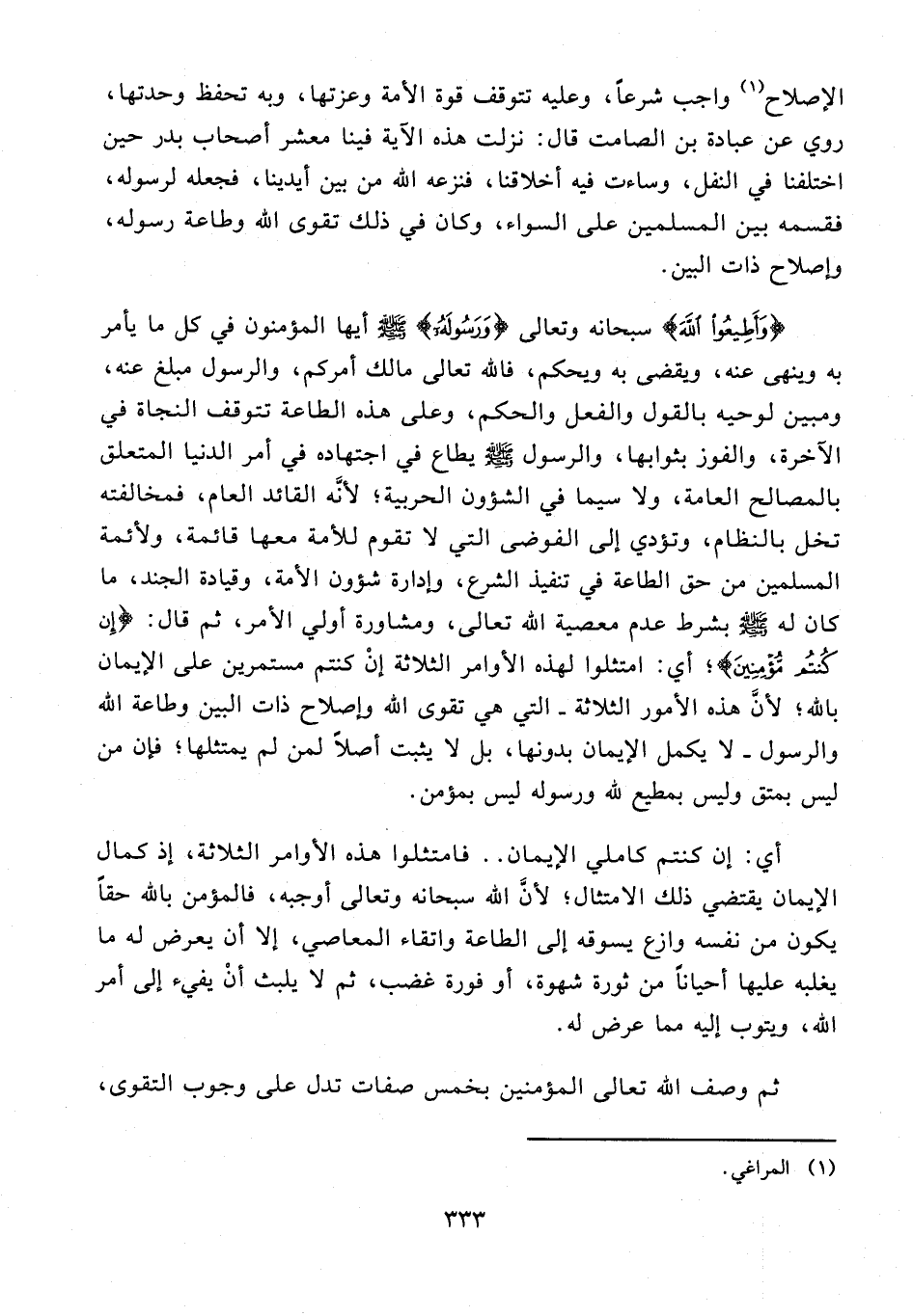 الإصلاح (¬1) واجب شرعا، وعليه تتوقف قوة الأمة وعزتها، وبه تحفظ وحدتها، روي عن عبادة بن الصامت قال: نزلت هذه الآية فينا معشر أصحاب بدر حين اختلفنا في النفل، وساءت فيه أخلاقنا، فنزعه الله من بين أيدينا، فجعله لرسوله، فقسمه بين المسلمين على السواء، وكان في ذلك تقوى الله وطاعة رسوله، وإصلاح ذات البين.