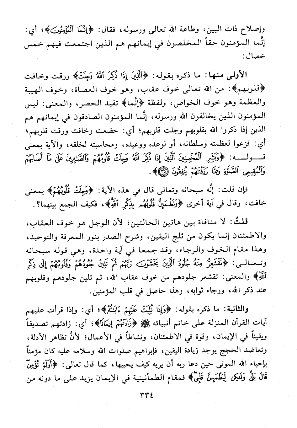 فإن قلت: إنّه سبحانه وتعالى قال في هذه الآية: {وَجِلَتْ قُلُوبُهُمْ} بمعنى خافت، وقال في آية أخرى {وَتَطْمَئِنُّ قُلُوبُهُمْ بِذِكْرِ اللَّهِ}، فكيف الجمع بينهما؟.