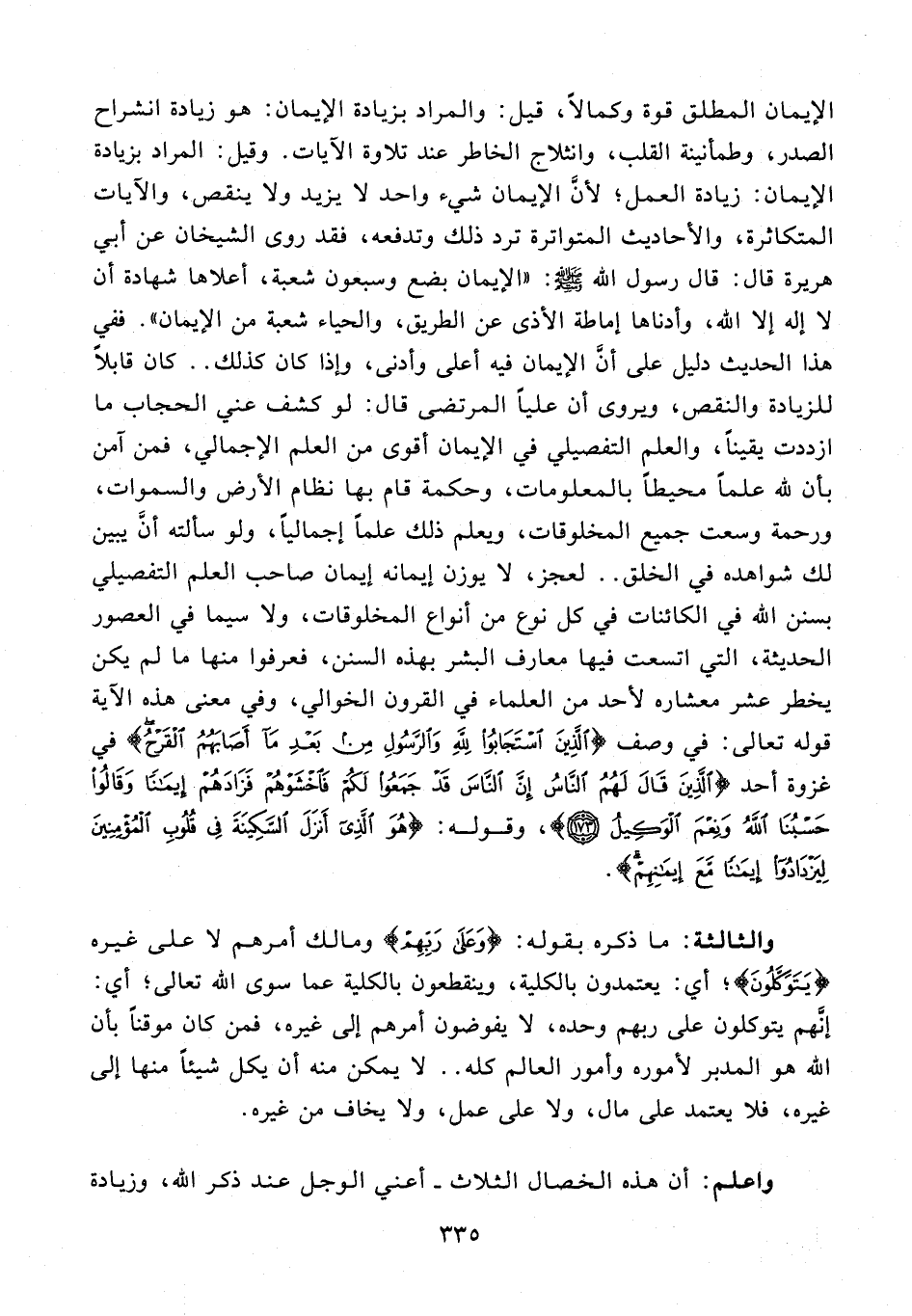 واعلم: أن هذه الخصال الثلاث - أعني الوجل عند ذكر الله، وزيادة