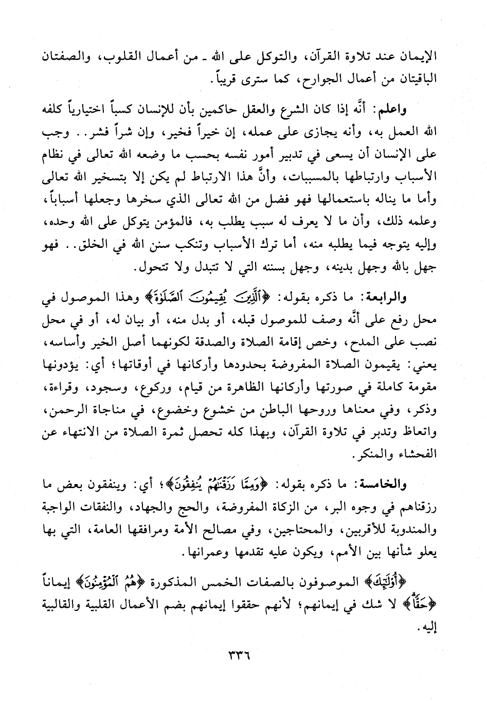 3 - والرابعة: ما ذكره بقوله: {الَّذِينَ يُقِيمُونَ الصَّلاةَ} وهذا الموصول في محل رفع على أنّه وصف للموصول قبله، أو بدل منه، أو بيان له، أو في محل نصب على المدح، وخص إقامة الصلاة والصدقة لكونهما أصل الخير وأساسه، يعني: يقيمون الصلاة المفروضة بحدودها وأركانها في أوقاتها؛ أي: يؤدونها مقومة كاملة في صورتها وأركانها الظاهرة من قيام، وركوع، وسجود، وقراءة، وذكر، وفي معناها وروحها الباطن من خشوع وخضوع، في مناجاة الرحمن، واتعاظ وتدبر في تلاوة القرآن، وبهذا كله تحصل ثمرة الصلاة من الانتهاء عن الفحشاء والمنكر.