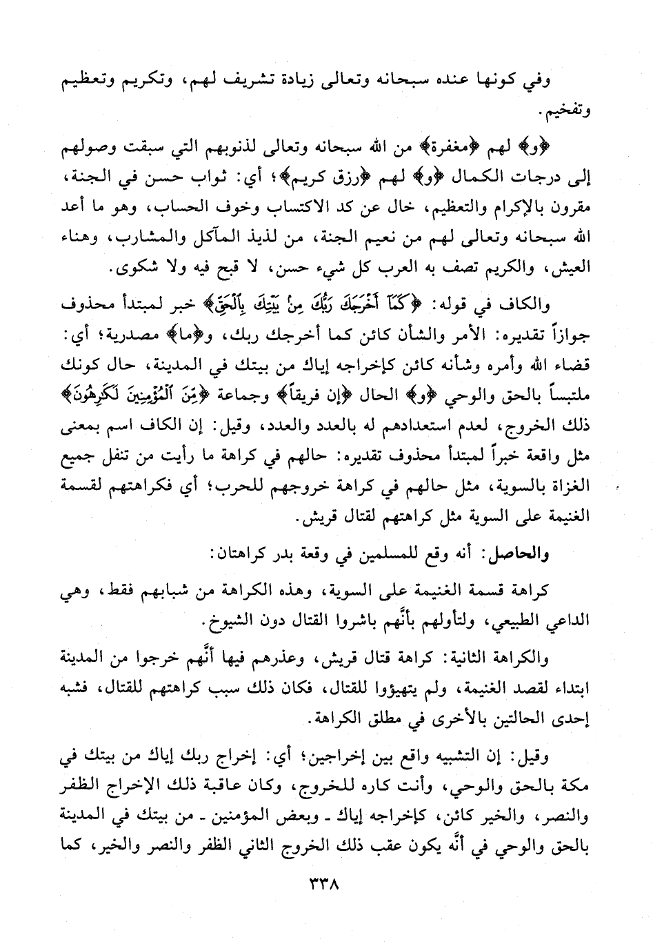5 - والكاف في قوله: {كَما أَخْرَجَكَ رَبُّكَ مِنْ بَيْتِكَ بِالْحَقِّ} خبر لمبتدأ محذوف جوازا تقديره: الأمر والشأن كائن كما أخرجك ربك، و {ما} مصدرية؛ أي: قضاء الله وأمره وشأنه كائن كإخراجه إياك من بيتك في المدينة، حال كونك ملتبسا بالحق والوحي {وَ} الحال {إِنَّ فَرِيقًا} وجماعة {مِنَ الْمُؤْمِنِينَ لَكارِهُونَ} ذلك الخروج، لعدم استعدادهم له بالعدد والعدد، وقيل: إن الكاف اسم بمعنى مثل واقعة خبرا لمبتدأ محذوف تقديره: حالهم في كراهة ما رأيت من تنفل جميع الغزاة بالسوية، مثل حالهم في كراهة خروجهم للحرب؛ أي فكراهتهم لقسمة الغنيمة على السوية مثل كراهتهم لقتال قريش.