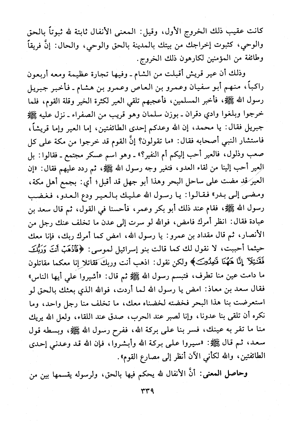 وذلك أن عير قريش أقبلت من الشام - وفيها تجارة عظيمة ومعه أربعون راكبا، منهم أبو سفيان وعمرو بن العاص وعمرو بن هشام - فأخبر جبريل رسول الله صلى الله عليه وسلّم، فأخبر المسلمين، فأعجبهم تلقي العير لكثرة الخير وقلة القوم، فلما خرجوا وبلغوا وادي دقران - بوزن سلمان وهو قريب من الصفراء - نزل عليه صلى الله عليه وسلّم جبريل فقال: يا محمد، إن الله وعدكم إحدى الطائفتين، إما العير وإما قريشا، فاستشار النبي أصحابه فقال: «ما تقولون؟ إنّ القوم قد خرجوا من مكة على كل صعب وذلول، فالعير أحب إليكم أم النفير؟» - وهو اسم عسكر مجتمع - فقالوا: بل العير أحب إلينا من لقاء العدو، فتغير وجه رسول الله صلى الله عليه وسلّم، ثم ردد عليهم فقال: «إن العير قد مضت على ساحل البحر وهذا أبو جهل قد أقبل؛ أي: بجمع أهل مكة، ومضى إلى بدر» فقالوا: يا رسول الله عليك بالعير ودع العدو، فغضب رسول الله صلى الله عليه وسلّم، فقام عند ذلك أبو بكر وعمر، فأحسنا في القول، ثم قال سعد بن عبادة فقال: انظر أمرك فامض، فو الله لو سرت إلى عدن ما تخلف عنك رجل من الأنصار، ثم قال مقداد بن عمرو: يا رسول الله، امض كما أمرك ربك، فإنا معك حيثما أحببت، لا نقول لك كما قالت بنو إسرائيل لموسى: {فَاذْهَبْ أَنْتَ وَرَبُّكَ فَقاتِلا إِنَّا هاهُنا قاعِدُونَ} ولكن نقول: اذهب أنت وربك فقاتلا إنا معكما مقاتلون ما دامت عين منا تطرف، فتبسم رسول الله صلى الله عليه وسلّم ثم قال: «أشيروا علي أيها الناس» فقال سعد بن معاذ: امض يا رسول الله لما أردت، فو الله الذي بعثك بالحق لو استعرضت بنا هذا البحر فخضته لخضناه معك، ما تخلف منا رجل واحد، وما نكره أن تلقى بنا عدونا، وإنا لصبر عند الحرب، صدق عند اللقاء، ولعل الله يريك منا ما تقر به عينك، فسر بنا على بركة الله، ففرح رسول الله صلى الله عليه وسلّم، وبسطه قول سعد، ثم قال صلى الله عليه وسلّم: «سيروا على بركة الله وأبشروا، فإن الله قد وعدني إحدى الطائفتين، والله لكأني الآن أنظر إلى مصارع القوم».