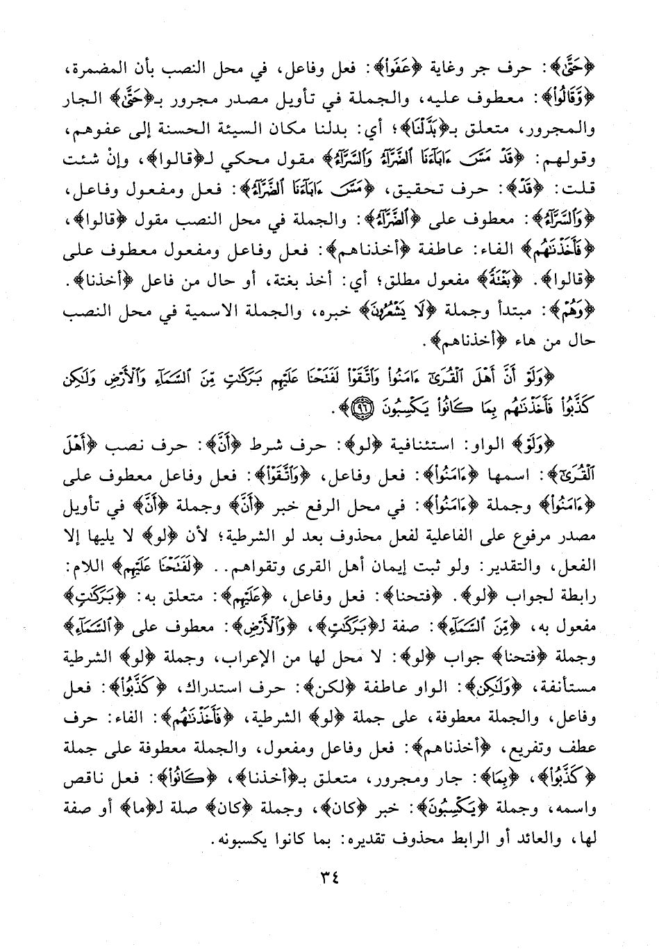 {وَلَوْ} الواو: استئنافية {لَوْ}: حرف شرط {أَنَّ}: حرف نصب {أَهْلَ الْقُرى}: اسمها {آمَنُوا}: فعل وفاعل، {وَاتَّقَوْا}: فعل وفاعل معطوف على {آمَنُوا} وجملة {آمَنُوا}: في محل الرفع خبر {أَنَّ} وجملة {أَنَّ} في تأويل مصدر مرفوع على الفاعلية لفعل محذوف بعد لو الشرطية؛ لأن {لَوْ} لا يليها إلا الفعل، والتقدير: ولو ثبت إيمان أهل القرى وتقواهم .. {لَفَتَحْنا عَلَيْهِمْ} اللام:
