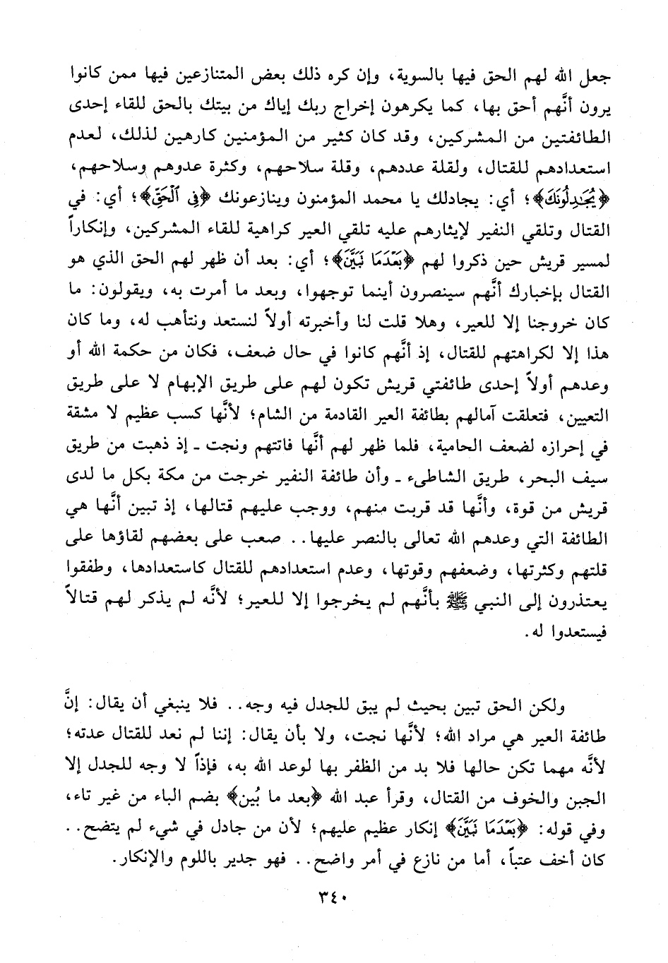 ولكن الحق تبين بحيث لم يبق للجدل فيه وجه .. فلا ينبغي أن يقال: إنّ طائفة العير هي مراد الله؛ لأنّها نجت، ولا بأن يقال: إننا لم نعد للقتال عدته؛ لأنّه مهما تكن حالها فلا بد من الظفر بها لوعد الله به، فإذا لا وجه للجدل إلا الجبن والخوف من القتال، وقرأ عبد الله {بعد ما بين} بضم الباء من غير تاء، وفي قوله: {بَعْدَ ما تَبَيَّنَ} إنكار عظيم عليهم؛ لأن من جادل في شيء لم يتضح .. كان أخف عتبا، أما من نازع في أمر واضح .. فهو جدير باللوم والإنكار.