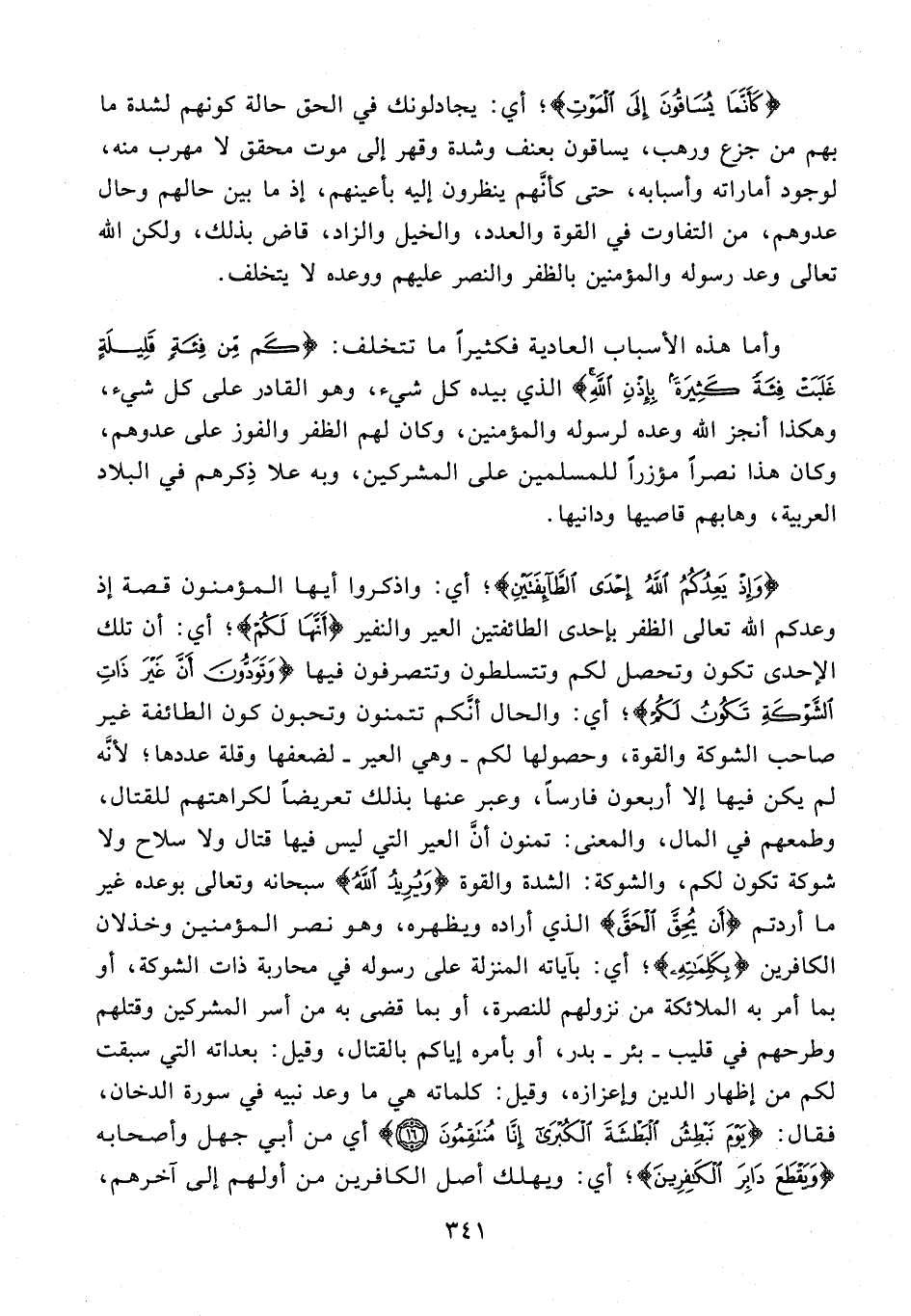 7 - {وَإِذْ يَعِدُكُمُ اللَّهُ إِحْدَى الطَّائِفَتَيْنِ}؛ أي: واذكروا أيها المؤمنون قصة إذ وعدكم الله تعالى الظفر بإحدى الطائفتين العير والنفير {أَنَّها لَكُمْ}؛ أي: أن تلك الإحدى تكون وتحصل لكم وتتسلطون وتتصرفون فيها {وَتَوَدُّونَ أَنَّ غَيْرَ ذاتِ الشَّوْكَةِ تَكُونُ لَكُمْ}؛ أي: والحال أنّكم تتمنون وتحبون كون الطائفة غير صاحب الشوكة والقوة، وحصولها لكم - وهي العير - لضعفها وقلة عددها؛ لأنّه لم يكن فيها إلا أربعون فارسا، وعبر عنها بذلك تعريضا لكراهتهم للقتال، وطمعهم في المال، والمعنى: تمنون أنّ العير التي ليس فيها قتال ولا سلاح ولا شوكة تكون لكم، والشوكة: الشدة والقوة {وَيُرِيدُ اللَّهُ} سبحانه وتعالى بوعده غير ما أردتم {أَنْ يُحِقَّ الْحَقَّ} الذي أراده ويظهره، وهو نصر المؤمنين وخذلان الكافرين {بِكَلِماتِهِ}؛ أي: بآياته المنزلة على رسوله في محاربة ذات الشوكة، أو بما أمر به الملائكة من نزولهم للنصرة، أو بما قضى به من أسر المشركين وقتلهم وطرحهم في قليب - بئر - بدر، أو بأمره إياكم بالقتال، وقيل: بعداته التي سبقت لكم من إظهار الدين وإعزازه، وقيل: كلماته هي ما وعد نبيه في سورة الدخان، فقال: {يَوْمَ نَبْطِشُ الْبَطْشَةَ الْكُبْرى إِنَّا مُنْتَقِمُونَ (16)} أي من أبي جهل وأصحابه {وَيَقْطَعَ دابِرَ الْكافِرِينَ}؛ أي: ويهلك أصل الكافرين من أولهم إلى آخرهم،