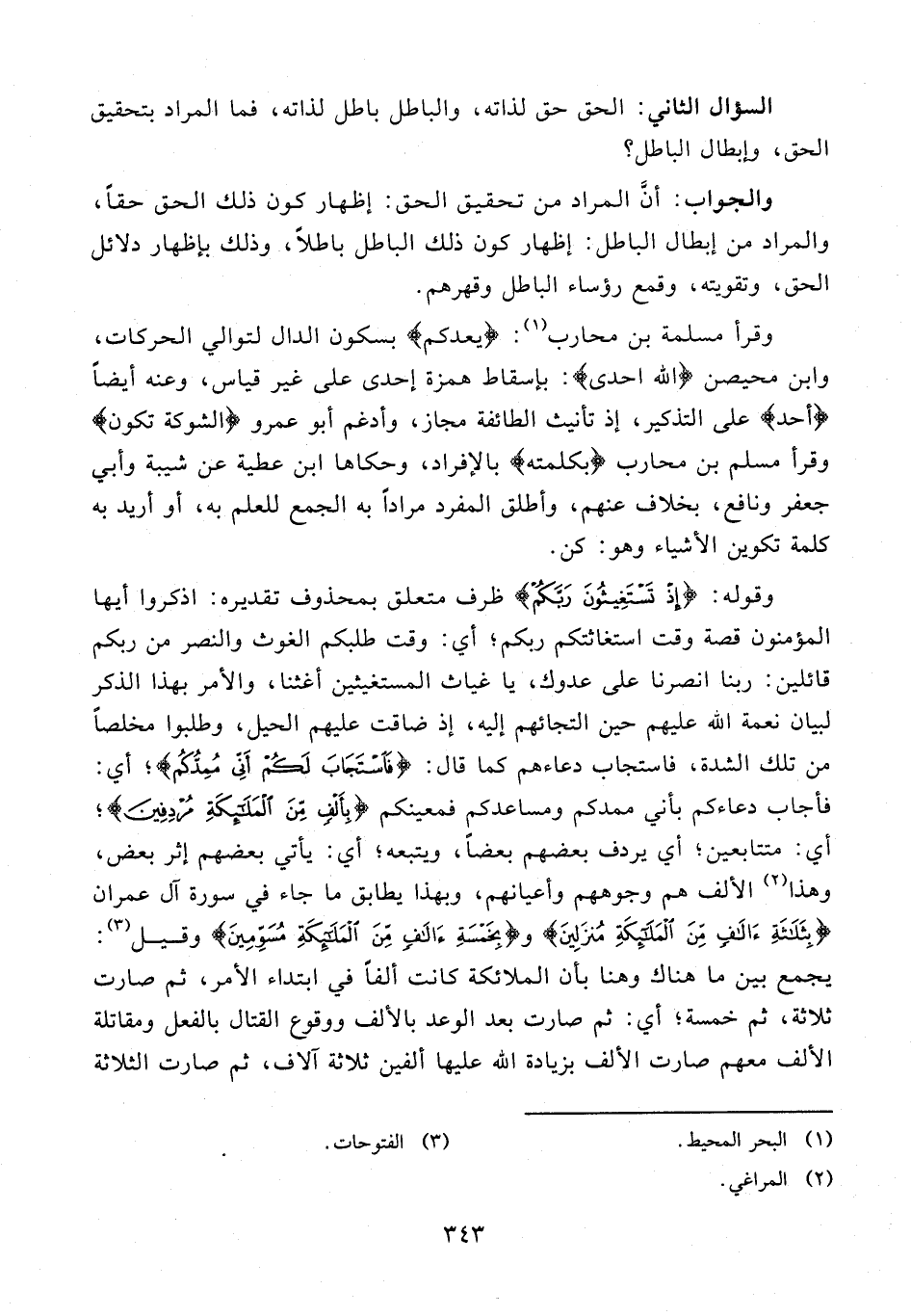 9 - وقوله: {إِذْ تَسْتَغِيثُونَ رَبَّكُمْ} ظرف متعلق بمحذوف تقديره: اذكروا أيها المؤمنون قصة وقت استغاثتكم ربكم؛ أي: وقت طلبكم الغوث والنصر من ربكم قائلين: ربنا انصرنا على عدوك، يا غياث المستغيثين أغثنا، والأمر بهذا الذكر لبيان نعمة الله عليهم حين التجائهم إليه، إذ ضاقت عليهم الحيل، وطلبوا مخلصا من تلك الشدة، فاستجاب دعاءهم كما قال: {فَاسْتَجابَ لَكُمْ أَنِّي مُمِدُّكُمْ}؛ أي: فأجاب دعاءكم بأني ممدكم ومساعدكم فمعينكم {بِأَلْفٍ مِنَ الْمَلائِكَةِ مُرْدِفِينَ}؛ أي: متتابعين؛ أي يردف بعضهم بعضا، ويتبعه؛ أي: يأتي بعضهم إثر بعض، وهذا (¬2) الألف هم وجوههم وأعيانهم، وبهذا يطابق ما جاء في سورة آل عمران {بِثَلاثَةِ آلافٍ مِنَ الْمَلائِكَةِ مُنْزَلِينَ} و {بِخَمْسَةِ آلافٍ مِنَ الْمَلائِكَةِ مُسَوِّمِينَ} وقيل (¬3): يجمع بين ما هناك وهنا بأن الملائكة كانت ألفا في ابتداء الأمر، ثم صارت ثلاثة، ثم خمسة؛ أي: ثم صارت بعد الوعد بالألف ووقوع القتال بالفعل ومقاتلة الألف معهم صارت الألف بزيادة الله عليها ألفين ثلاثة آلاف، ثم صارت الثلاثة