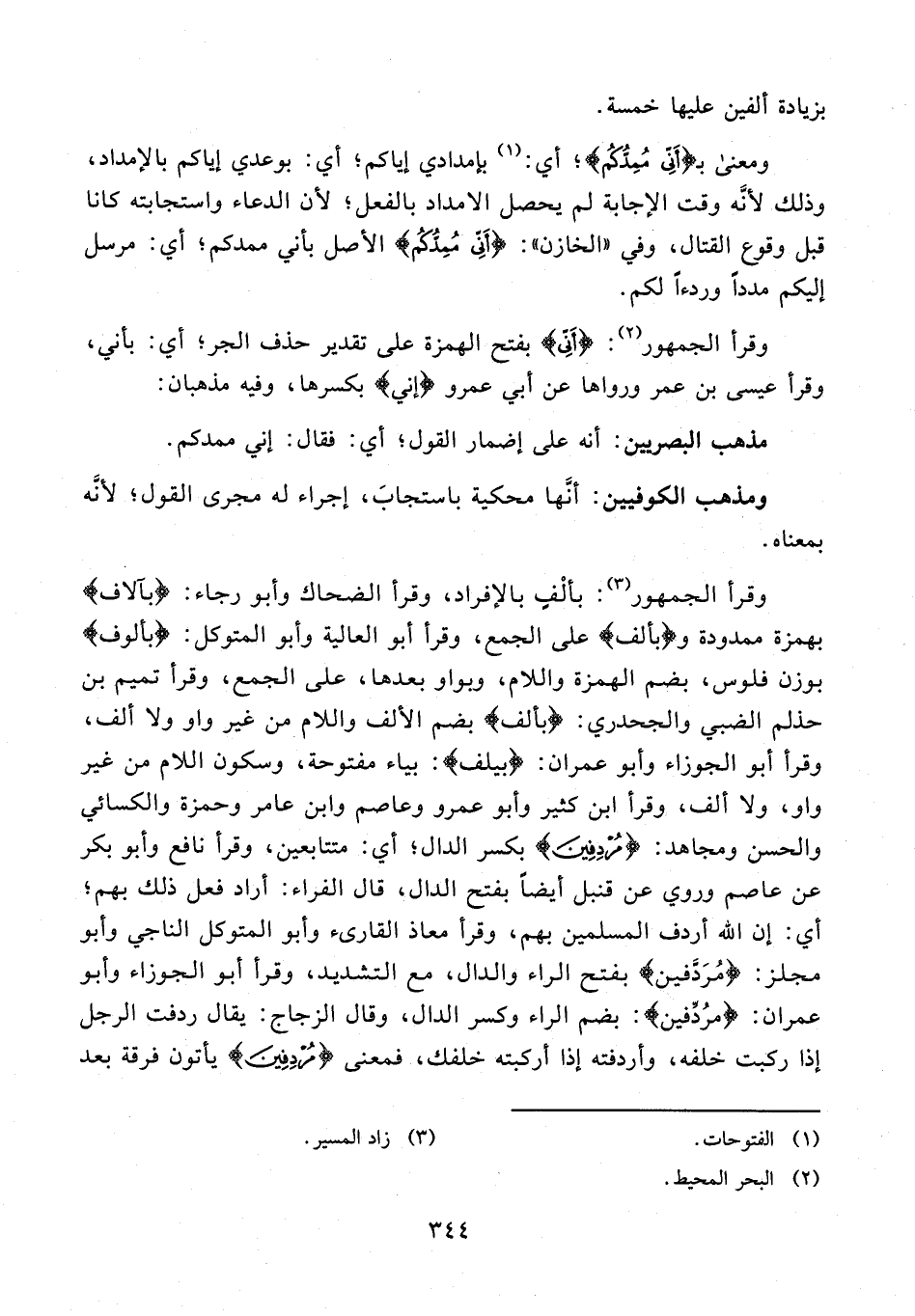 وقرأ الجمهور (¬3): بألف بالإفراد، وقرأ الضحاك وأبو رجاء: {بآلاف} بهمزة ممدودة و {بِأَلْفٍ} على الجمع، وقرأ أبو العالية وأبو المتوكل: {بألوف} بوزن فلوس، بضم الهمزة واللام، وبواو بعدها، على الجمع، وقرأ تميم بن حذلم الضبي والجحدري: {بألف} بضم الألف واللام من غير واو ولا ألف، وقرأ أبو الجوزاء وأبو عمران: {بيلف}: بياء مفتوحة، وسكون اللام من غير واو، ولا ألف، وقرأ ابن كثير وأبو عمرو وعاصم وابن عامر وحمزة والكسائي والحسن ومجاهد: {مُرْدِفِينَ} بكسر الدال؛ أي: متتابعين، وقرأ نافع وأبو بكر عن عاصم وروي عن قنبل أيضا بفتح الدال، قال الفراء: أراد فعل ذلك بهم؛ أي: إن الله أردف المسلمين بهم، وقرأ معاذ القارىء وأبو المتوكل الناجي وأبو مجلز: {مُرْدِفِينَ} بفتح الراء والدال، مع التشديد، وقرأ أبو الجوزاء وأبو عمران: {مُرْدِفِينَ}: بضم الراء وكسر الدال، وقال الزجاج: يقال ردفت الرجل إذا ركبت خلفه، وأردفته إذا أركبته خلفك، فمعنى {مُرْدِفِينَ} يأتون فرقة بعد