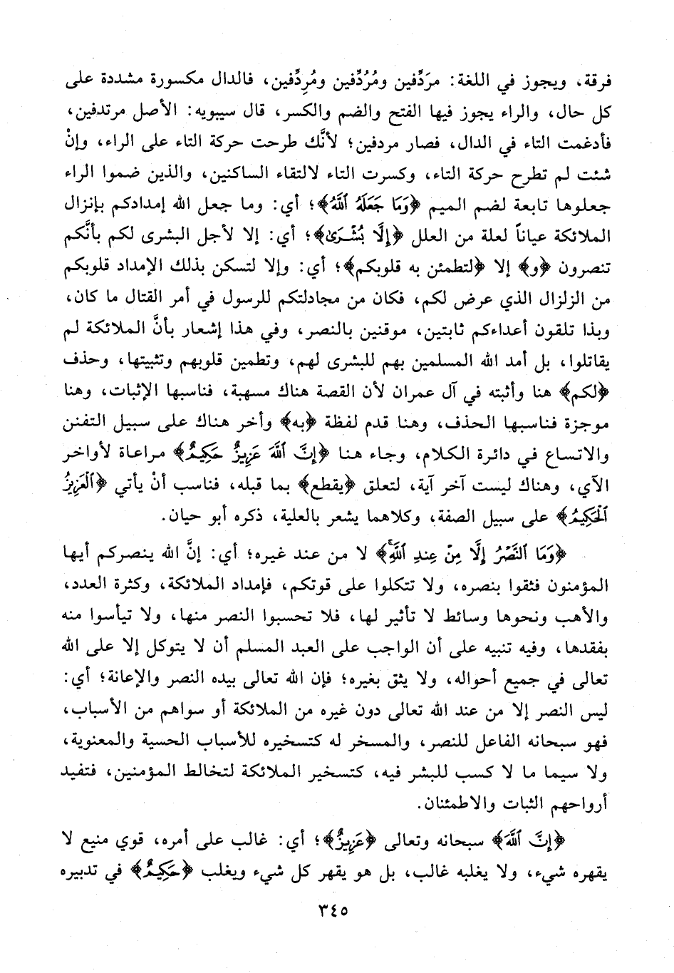 10 - {وَما جَعَلَهُ اللَّهُ}؛ أي: وما جعل الله إمدادكم بإنزال الملائكة عيانا لعلة من العلل {إِلَّا بُشْرى}؛ أي: إلا لأجل البشرى لكم بأنّكم تنصرون {وَ} إلا {لِتَطْمَئِنَّ بِهِ قُلُوبُكُمْ}؛ أي: وإلا لتسكن بذلك الإمداد قلوبكم من الزلزال الذي عرض لكم، فكان من مجادلتكم للرسول في أمر القتال ما كان، وبذا تلقون أعداءكم ثابتين، موقنين بالنصر، وفي هذا إشعار بأنّ الملائكة لم يقاتلوا، بل أمد الله المسلمين بهم للبشرى لهم، وتطمين قلوبهم وتثبيتها، وحذف {لكم} هنا وأثبته في آل عمران لأن القصة هناك مسهبة، فناسبها الإثبات، وهنا موجزة فناسبها الحذف، وهنا قدم لفظة {بِهِ} وأخر هناك على سبيل التفنن والاتساع في دائرة الكلام، وجاء هنا {إِنَّ اللَّهَ عَزِيزٌ حَكِيمٌ} مراعاة لأواخر الآي، وهناك ليست آخر آية، لتعلق {يَقْطَعَ} بما قبله، فناسب أن يأتي {العزيز الحكيم} على سبيل الصفة، وكلاهما يشعر بالعلية، ذكره أبو حيان.