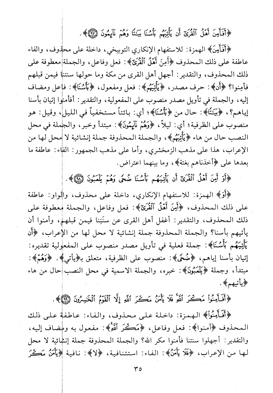{أَفَأَمِنَ} الهمزة: للاستفهام الإنكاري التوبيخي، داخلة على محذوف، والفاء عاطفة على ذلك المحذوف {أمن أهل القرى}: فعل وفاعل، والجملة معطوفة على ذلك المحذوف، والتقدير: أجهل أهل القرى من مكة وما حولها سنتنا فيمن قبلهم فأمنوا؟ {أَنْ}: حرف مصدر، {يَأْتِيَهُمْ}: فعل ومفعول، {بَأْسُنا}: فاعل ومضاف إليه، والجملة في تأويل مصدر منصوب على المفعولية، والتقدير: أفأمنوا إتيان بأسنا إياهم؟، {بَياتًا}: حال من {بَأْسُنا}؛ أي: بائتا مستخفيا في الليل، وقيل: هو منصوب على الظرفية؛ أي: ليلا، {وَهُمْ نائِمُونَ}: مبتدأ وخبر، والجملة في محل النصب حال من هاء {يَأْتِيَهُمْ}، والجملة المحذوفة جملة إنشائية لا محل لها من الإعراب، هذا على مذهب الزمخشري، وأما على مذهب الجمهور: الفاء: عاطفة ما بعدها على {أخذناهم بغتة}، وما بينهما اعتراض.