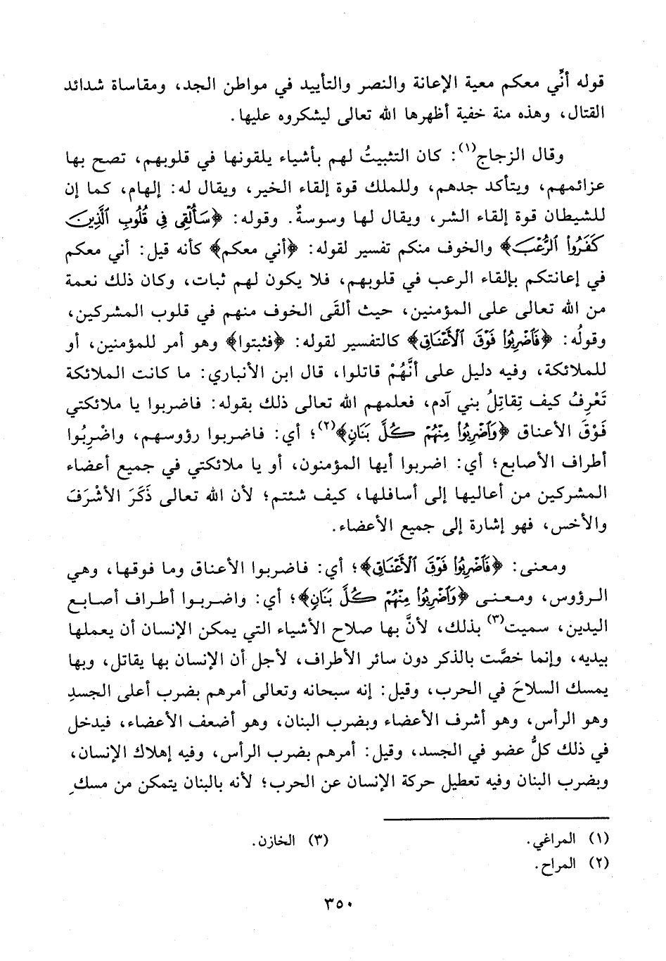 وقال الزجاج (¬1): كان التثبيت لهم بأشياء يلقونها في قلوبهم، تصح بها عزائمهم، ويتأكد جدهم، وللملك قوة إلقاء الخير، ويقال له: إلهام، كما إن للشيطان قوة إلقاء الشر، ويقال لها وسوسة. وقوله: {سَأُلْقِي فِي قُلُوبِ الَّذِينَ كَفَرُوا الرُّعْبَ} والخوف منكم تفسير لقوله: {أَنِّي مَعَكُمْ} كأنه قيل: أني معكم في إعانتكم بإلقاء الرعب في قلوبهم، فلا يكون لهم ثبات، وكان ذلك نعمة من الله تعالى على المؤمنين، حيث ألقى الخوف منهم في قلوب المشركين، وقوله: {فَاضْرِبُوا فَوْقَ الْأَعْناقِ} كالتفسير لقوله: {فَثَبِّتُوا} وهو أمر للمؤمنين، أو للملائكة، وفيه دليل على أنّهم قاتلوا، قال ابن الأنباري: ما كانت الملائكة تعرف كيف تقاتل بني آدم، فعلمهم الله تعالى ذلك بقوله: فاضربوا يا ملائكتي فوق الأعناق {وَاضْرِبُوا مِنْهُمْ كُلَّ بَنانٍ} (¬2)؛ أي: فاضربوا رؤوسهم، واضربوا أطراف الأصابع؛ أي: اضربوا أيها المؤمنون، أو يا ملائكتي في جميع أعضاء المشركين من أعاليها إلى أسافلها، كيف شئتم؛ لأن الله تعالى ذكر الأشرف والأخس، فهو إشارة إلى جميع الأعضاء.