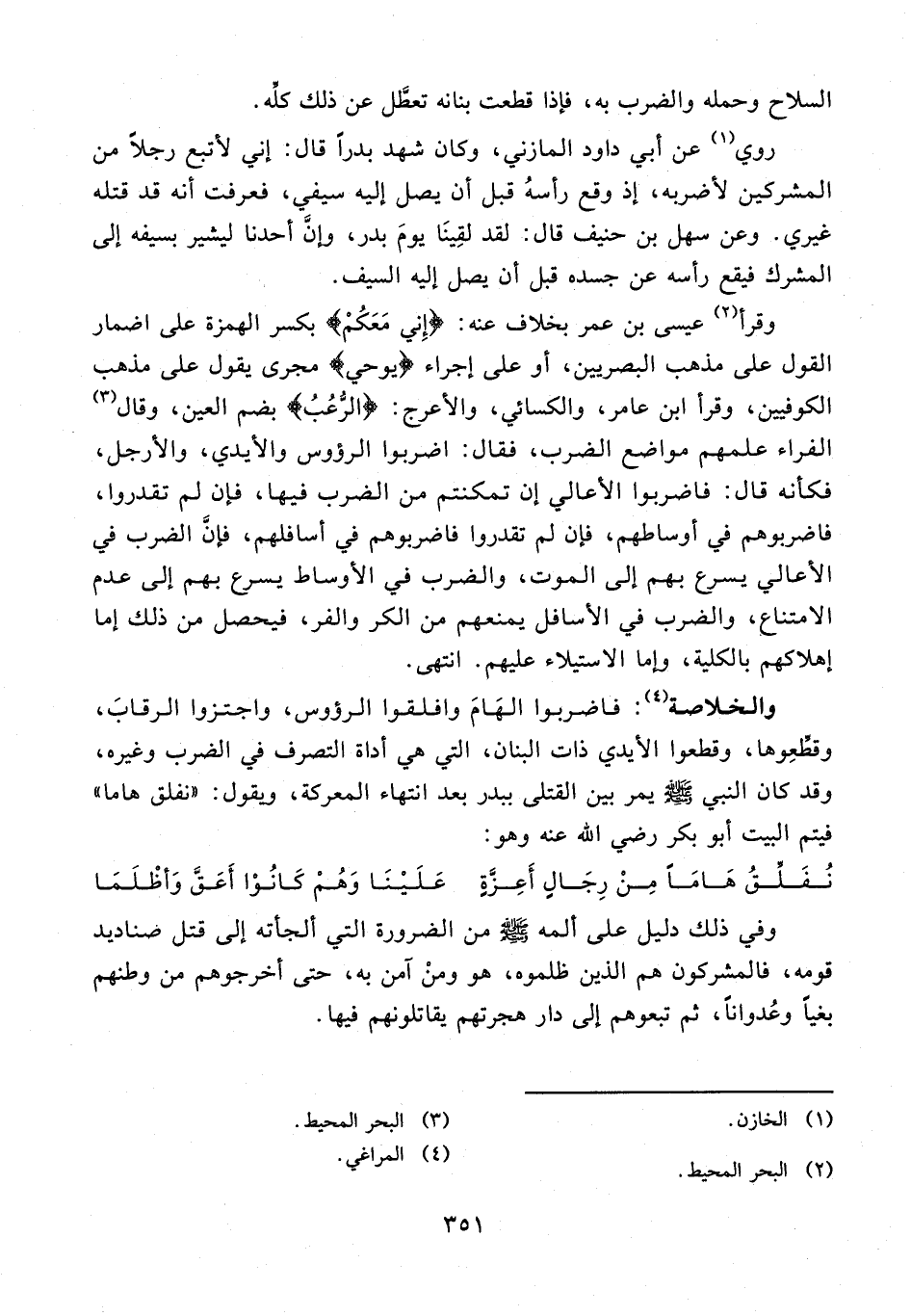 والخلاصة (¬4): فاضربوا الهام وافلقوا الرؤوس، واجتزوا الرقاب، وقطّعوها، وقطعوا الأيدي ذات البنان، التي هي أداة التصرف في الضرب وغيره، وقد كان النبي صلى الله عليه وسلّم يمر بين القتلى ببدر بعد انتهاء المعركة، ويقول: «نفلق هاما» فيتم البيت أبو بكر رضي الله عنه وهو: