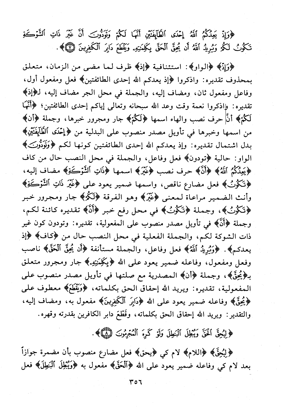 {وَإِذْ} {الواو}: استئنافية {إِذْ} ظرف لما مضى من الزمان، متعلق بمحذوف تقديره: واذكروا {إِذْ يَعِدُكُمُ اللَّهُ إِحْدَى الطَّائِفَتَيْنِ} فعل ومفعول أول، وفاعل ومفعول ثان، ومضاف إليه، والجملة في محل الجر مضاف إليه، لـ {إِذْ} تقديره: واذكروا نعمة وقت وعد الله سبحانه وتعالى إياكم إحدى الطائفتين؛ {أَنَّها} لَكُمْ أنّ حرف نصب والهاء اسمها {لَكُمْ} جار ومجرور خبرها، وجملة {أَنَّ} من اسمها وخبرها في تأويل مصدر منصوب على البدلية من {إِحْدَى الطَّائِفَتَيْنِ} بدل اشتمال تقديره: وإذ يعدكم الله إحدى الطائفتين كونها لكم {وَتَوَدُّونَ} الواو: حالية {تَوَدُّونَ} فعل وفاعل، والجملة في محل النصب حال من كاف {يَعِدُكُمُ اللَّهُ} {أَنَّ} حرف نصب {غَيْرَ} اسمها {ذاتِ الشَّوْكَةِ} مضاف إليه، {تَكُونُ} فعل مضارع ناقص، واسمها ضمير يعود على {غَيْرَ ذاتِ الشَّوْكَةِ} وأنث الضمير مراعاة لمعنى {غَيْرَ} وهو الفرقة {لَكُمْ} جار ومجرور خبر {تَكُونُ}، وجملة {تَكُونُ} في محل رفع خبر {أَنَّ} تقديره كائنة لكم، وجملة {أَنَّ} في تأويل مصدر منصوب على المفعولية، تقديره: وتودون كون غير ذات الشوكة لكم، والجملة الفعلية في محل النصب حال من {كاف} {إِذْ يَعِدُكُمُ}. {وَيُرِيدُ اللَّهُ} فعل وفاعل، والجملة مستأنفة {أَنْ يُحِقَّ الْحَقَّ} ناصب وفعل ومفعول، وفاعله ضمير يعود على الله {بِكَلِماتِهِ} جار ومجرور متعلق بـ {يُحِقَّ}، وجملة {أَنَّ} المصدرية مع صلتها في تأويل مصدر منصوب على المفعولية، تقديره: ويريد الله إحقاق الحق بكلماته، {وَيَقْطَعَ} معطوف على {يُحِقَّ} وفاعله ضمير يعود على الله {دابِرَ الْكافِرِينَ} مفعول به، ومضاف إليه، والتقدير: ويريد الله إحقاق الحق بكلماته، وقطع دابر الكافرين بقدرته وقهره.