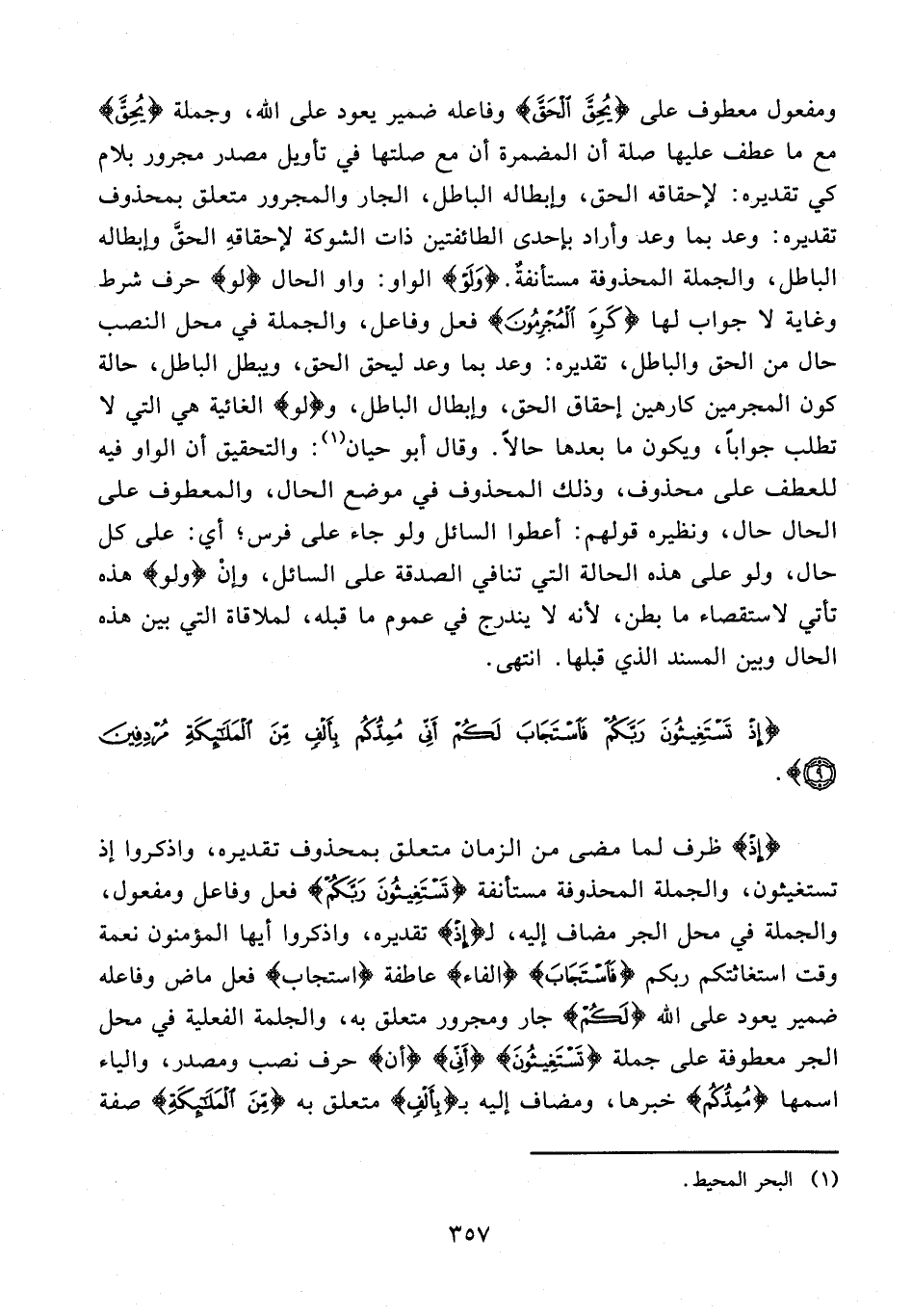 ومفعول معطوف على {يحقّ الحقّ} وفاعله ضمير يعود على الله، وجملة {يحقّ} مع ما عطف عليها صلة أن المضمرة أن مع صلتها في تأويل مصدر مجرور بلام كي تقديره: لإحقاقه الحق، وإبطاله الباطل، الجار والمجرور متعلق بمحذوف تقديره: وعد بما وعد وأراد بإحدى الطائفتين ذات الشوكة لإحقاقه الحقّ وإبطاله الباطل، والجملة المحذوفة مستأنفة. {وَلَوْ} الواو: واو الحال {لَوْ} حرف شرط وغاية لا جواب لها {كَرِهَ الْمُجْرِمُونَ} فعل وفاعل، والجملة في محل النصب حال من الحق والباطل، تقديره: وعد بما وعد ليحق الحق، ويبطل الباطل، حالة كون المجرمين كارهين إحقاق الحق، وإبطال الباطل، {ولَوْ} الغائية هي التي لا تطلب جوابا، ويكون ما بعدها حالا. وقال أبو حيان (¬1): والتحقيق أن الواو فيه للعطف على محذوف، وذلك المحذوف في موضع الحال، والمعطوف على الحال حال، ونظيره قولهم: أعطوا السائل ولو جاء على فرس؛ أي: على كل حال، ولو على هذه الحالة التي تنافي الصدقة على السائل، وإن {وَلَوْ} هذه تأتي لاستقصاء ما بطن، لأنه لا يندرج في عموم ما قبله، لملاقاة التي بين هذه الحال وبين المسند الذي قبلها. انتهى.