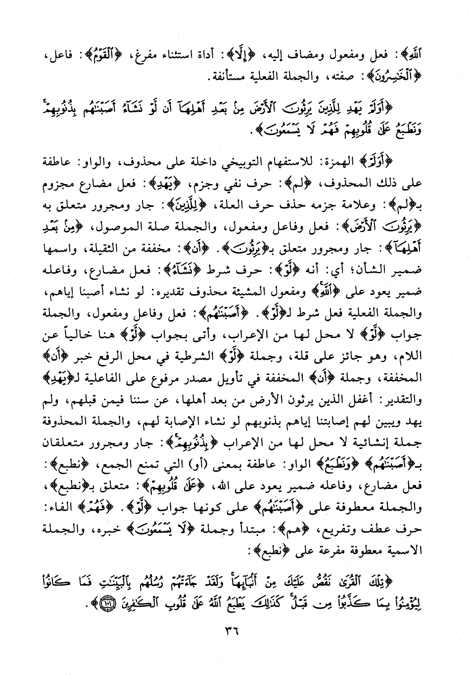 {أَوَلَمْ} الهمزة: للاستفهام التوبيخي داخلة على محذوف، والواو: عاطفة على ذلك المحذوف، {لَمْ}: حرف نفي وجزم، {يَهْدِ} - صلى الله عليه وسلم -: فعل مضارع مجزوم بـ {لَمْ}: وعلامة جزمه حذف حرف العلة، {لِلَّذِينَ}: جار ومجرور متعلق به {يَرِثُونَ الْأَرْضَ}: فعل وفاعل ومفعول، والجملة صلة الموصول، {مِنْ بَعْدِ أَهْلِها}: جار ومجرور متعلق بـ {يَرِثُونَ}. {أَنْ}: مخففة من الثقيلة، واسمها ضمير الشأن؛ أي: أنه {لَوْ}: حرف شرط {نَشاءُ}: فعل مضارع، وفاعله ضمير يعود على {اللَّهِ} ومفعول المشيئة محذوف تقديره: لو نشاء أصبنا إياهم، والجملة الفعلية فعل شرط لـ {لَوْ}. {أَصَبْناهُمْ}: فعل وفاعل ومفعول، والجملة جواب {لَوْ} لا محل لها من الإعراب، وأتى بجواب {لَوْ} هنا خاليا عن اللام، وهو جائز على قلة، وجملة {لَوْ} الشرطية في محل الرفع خبر {أَنْ} المخففة، وجملة {أَنْ} المخففة في تأويل مصدر مرفوع على الفاعلية لـ {يَهْدِ} والتقدير: أغفل الذين يرثون الأرض من بعد أهلها، عن سننا فيمن قبلهم، ولم يهد ويبين لهم إصابتنا إياهم بذنوبهم لو نشاء الإصابة لهم، والجملة المحذوفة جملة إنشائية لا محل لها من الإعراب {بِذُنُوبِهِمْ}: جار ومجرور متعلقان بـ {أَصَبْناهُمْ} {وَنَطْبَعُ} الواو: عاطفة بمعنى {أو} التي تمنع الجمع، {نَطْبَعُ}: فعل مضارع، وفاعله ضمير يعود على الله، {عَلى قُلُوبِهِمْ}: متعلق بـ {نَطْبَعُ}، والجملة معطوفة على {أَصَبْناهُمْ} على كونها جواب {لَوْ}. {فَهُمْ} الفاء: حرف عطف وتفريع، {هم}: مبتدأ وجملة {لا يَسْمَعُونَ} خبره، والجملة الاسمية معطوفة مفرعة على {نَطْبَعُ}: