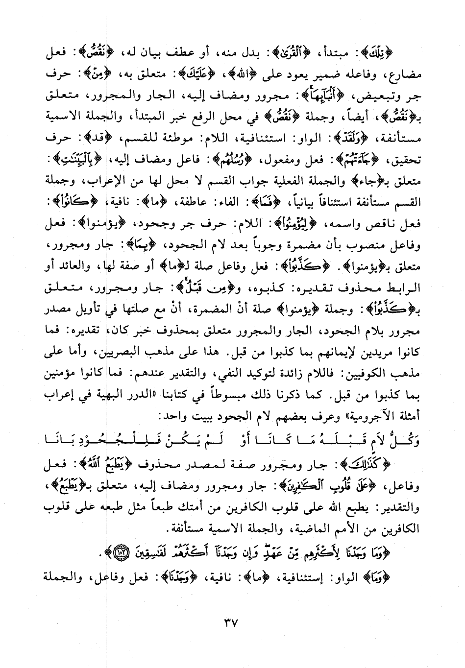 {تِلْكَ}: مبتدأ، {الْقُرى}: بدل منه، أو عطف بيان له، {نَقُصُّ}: فعل مضارع، وفاعله ضمير يعود على {اللَّهِ}، {عَلَيْكَ}: متعلق به، {مِنْ}: حرف جر وتبعيض، {أَنْبائِها}: مجرور ومضاف إليه، الجار والمجرور، متعلق بـ {نَقُصُّ}، أيضا، وجملة {نَقُصُّ} في محل الرفع خبر المبتدأ، والجملة الاسمية مستأنفة، {وَلَقَدْ}: الواو: استئنافية، اللام: موطئة للقسم، {قد}: حرف تحقيق، {جاءَتْهُمْ}: فعل ومفعول، {رُسُلُهُمْ}: فاعل ومضاف إليه، {بِالْبَيِّناتِ}: متعلق بـ {جاء} والجملة الفعلية جواب القسم لا محل لها من الإعراب، وجملة القسم مستأنفة استئنافا بيانيا، {فَما}: الفاء: عاطفة، {ما}: نافية، {كانُوا}: فعل ناقص واسمه، {لِيُؤْمِنُوا}: اللام: حرف جر وجحود، {يؤمنوا}: فعل وفاعل منصوب بأن مضمرة وجوبا بعد لام الجحود، {بِما}: جار ومجرور، متعلق بـ {يؤمنوا}. {كَذَّبُوا}: فعل وفاعل صلة لـ {ما} أو صفة لها، والعائد أو الرابط محذوف تقديره: كذبوه، و {مِنْ قَبْلُ}: جار ومجرور، متعلق بـ {كَذَّبُوا}: وجملة {يؤمنوا} صلة أن المضمرة، أن مع صلتها في تأويل مصدر مجرور بلام الجحود، الجار والمجرور متعلق بمحذوف خبر كان، تقديره: فما كانوا مريدين لإيمانهم بما كذبوا من قبل. هذا على مذهب البصريين، وأما على مذهب الكوفيين: فاللام زائدة لتوكيد النفي، والتقدير عندهم: فما كانوا مؤمنين بما كذبوا من قبل. كما ذكرنا ذلك مبسوطا في كتابنا «الدرر البهية في إعراب أمثلة الآجرومية» وعرف بعضهم لام الجحود ببيت واحد: