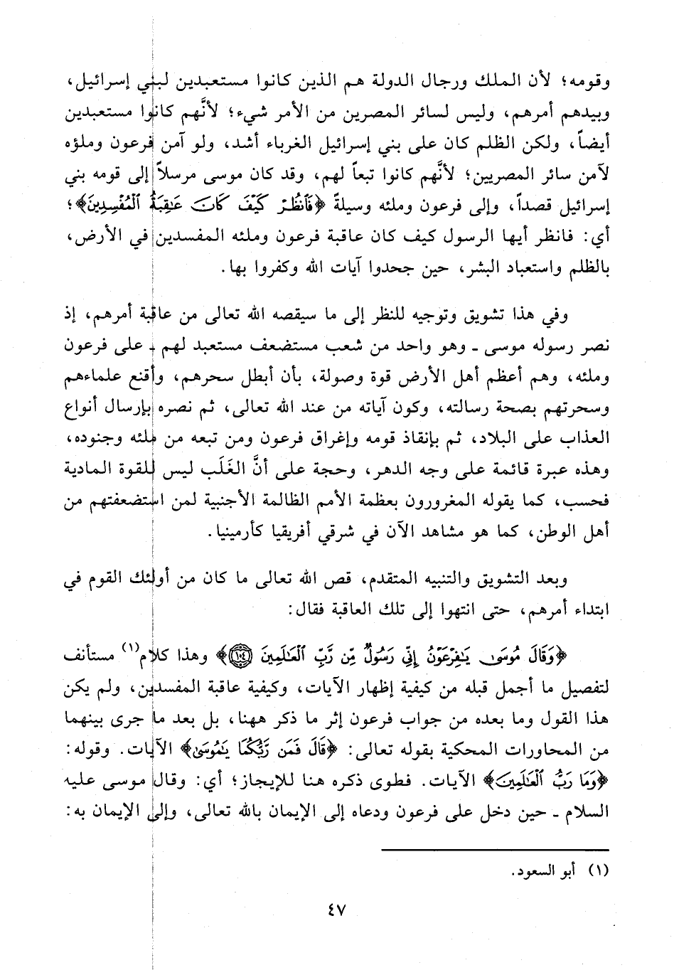 104 - {وَقالَ مُوسى يا فِرْعَوْنُ إِنِّي رَسُولٌ مِنْ رَبِّ الْعالَمِينَ (104)} وهذا كلام (¬1) مستأنف لتفصيل ما أجمل قبله من كيفية إظهار الآيات، وكيفية عاقبة المفسدين، ولم يكن هذا القول وما بعده من جواب فرعون إثر ما ذكر ههنا، بل بعد ما جرى بينهما من المحاورات المحكية بقوله تعالى: {قالَ فَمَنْ رَبُّكُما يا مُوسى} الآيات. وقوله: {وَما رَبُّ الْعالَمِينَ} الآيات. فطوى ذكره هنا للإيجاز؛ أي: وقال موسى عليه السلام - حين دخل على فرعون ودعاه إلى الإيمان بالله تعالى، وإلى الإيمان به: