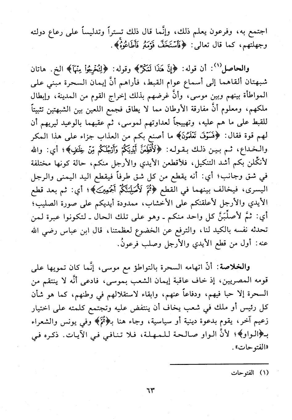والخلاصة: أنّ اتهامه السحرة بالتواطؤ مع موسى، إنّما كان تمويها على قومه المصريين، إذ خاف عاقبة إيمان الشعب بموسى، فادعى أنّه لا ينتقم من السحرة إلا حبا فيهم، ودفاعا عنهم، وابقاء لاستقلالهم في وطنهم، كما هو شأن كل رئيس أو ملك في شعب يخاف أن ينتفض عليه وتجتمع كلمته على اختيار زعيم آخر، يقوم بدعوة دينية أو سياسية، وجاء هنا بـ {ثُمَّ} وفي يونس والشعراء بـ {الواو}؛ لأنّ الواو صالحة للمهلة، فلا تنافي في الآيات. ذكره في «الفتوحات».