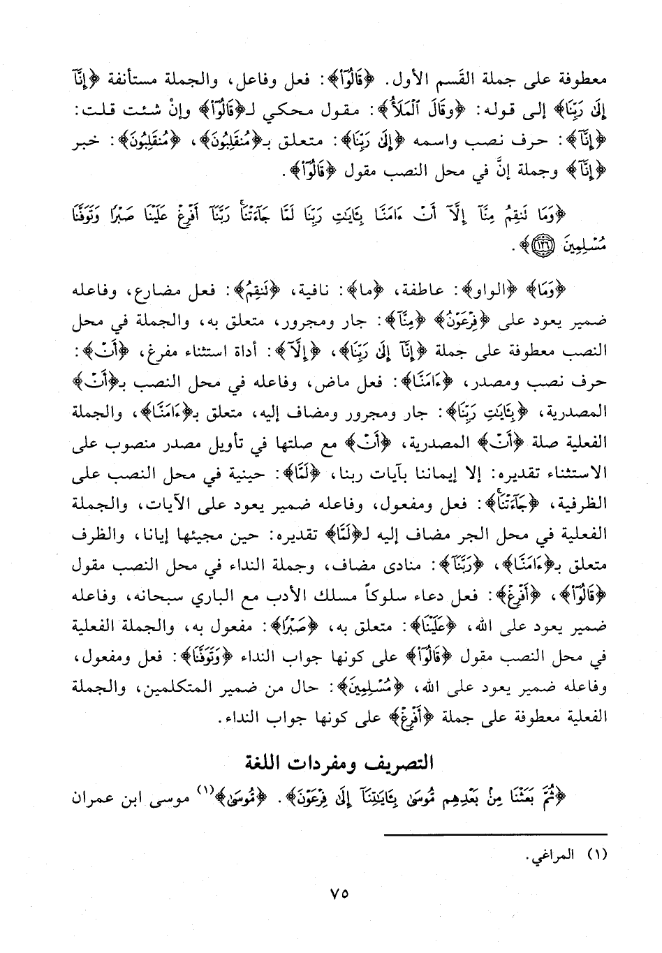 {وَما} {الواو}: عاطفة، {ما}: نافية، {تَنْقِمُ}: فعل مضارع، وفاعله ضمير يعود على {فِرْعَوْنُ مِنَّا}: جار ومجرور، متعلق به، والجملة في محل النصب معطوفة على جملة {إِنَّا إِلى رَبِّنا}، {إِلَّا}: أداة استثناء مفرغ، {أَنْ}: حرف نصب ومصدر، {آمَنَّا}: فعل ماض، وفاعله في محل النصب بـ {أَنْ} المصدرية، {بِآياتِ رَبِّنا}: جار ومجرور ومضاف إليه، متعلق بـ {آمَنَّا}، والجملة الفعلية صلة {أَنْ} المصدرية، {أَنْ} مع صلتها في تأويل مصدر منصوب على الاستثناء تقديره: إلا إيماننا بآيات ربنا، {لَمَّا}: حينية في محل النصب على الظرفية، {جاءَتْنا}: فعل ومفعول، وفاعله ضمير يعود على الآيات، والجملة الفعلية في محل الجر مضاف إليه لـ {لَمَّا} تقديره: حين مجيئها إيانا، والظرف متعلق بـ {آمَنَّا}، {رَبِّنا}: منادى مضاف، وجملة النداء في محل النصب مقول {قالُوا}، {أَفْرِغْ}: فعل دعاء سلوكا مسلك الأدب مع الباري سبحانه، وفاعله ضمير يعود على الله، {عَلَيْنا}: متعلق به، {صَبْرًا}: مفعول به، والجملة الفعلية في محل النصب مقول {قالُوا} على كونها جواب النداء {وَتَوَفَّنا}: فعل ومفعول، وفاعله ضمير يعود على الله، {مُسْلِمِينَ}: حال من ضمير المتكلمين، والجملة الفعلية معطوفة على جملة {أَفْرِغْ} على كونها جواب النداء.