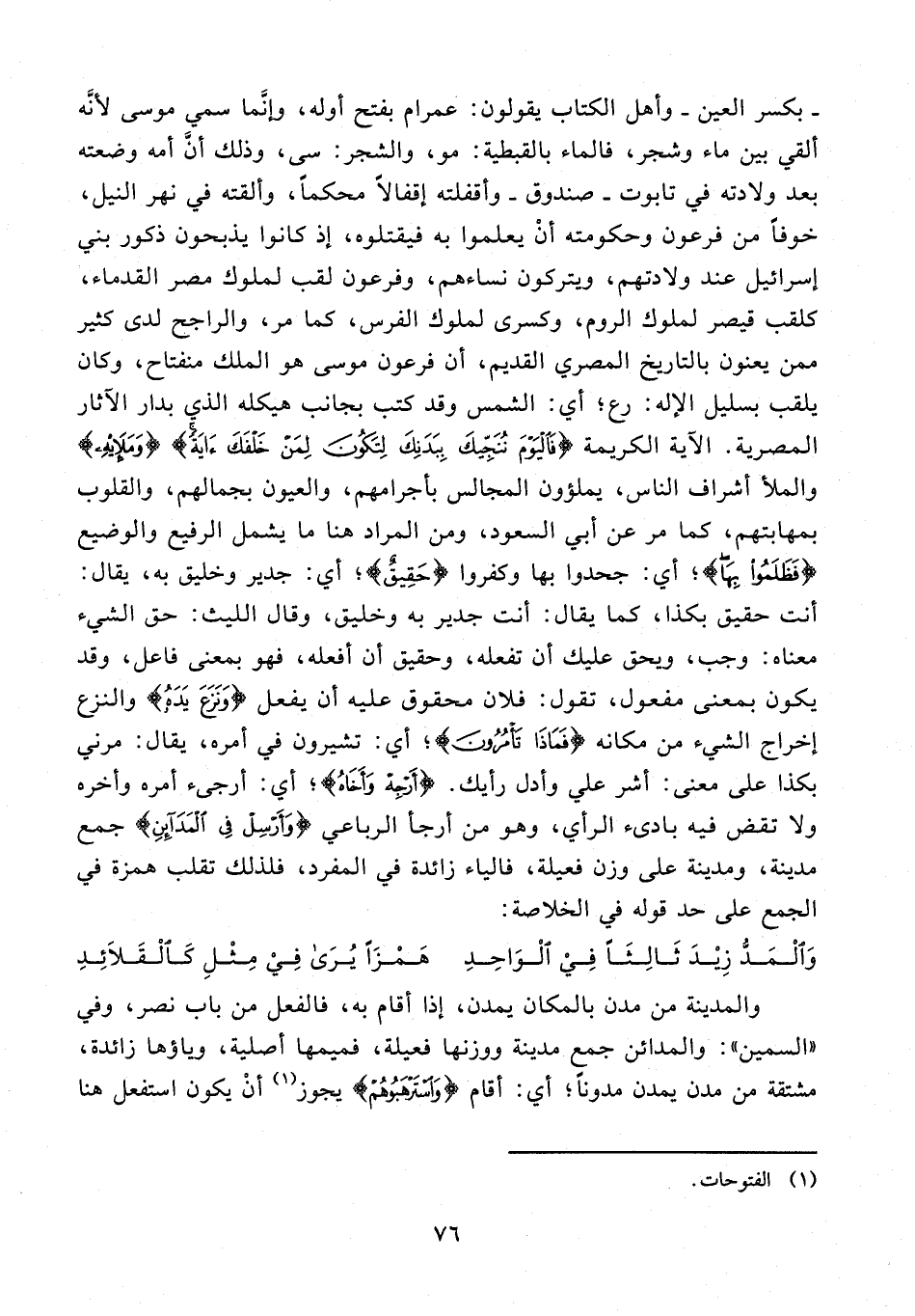 - بكسر العين - وأهل الكتاب يقولون: عمرام بفتح أوله، وإنّما سمي موسى لأنّه ألقي بين ماء وشجر، فالماء بالقبطية: مو، والشجر: سى، وذلك أنّ أمه وضعته بعد ولادته في تابوت - صندوق - وأقفلته إقفالا محكما، وألقته في نهر النيل، خوفا من فرعون وحكومته أن يعلموا به فيقتلوه، إذ كانوا يذبحون ذكور بني إسرائيل عند ولادتهم، ويتركون نساءهم، وفرعون لقب لملوك مصر القدماء، كلقب قيصر لملوك الروم، وكسرى لملوك الفرس، كما مر، والراجح لدى كثير ممن يعنون بالتاريخ المصري القديم، أن فرعون موسى هو الملك منفتاح، وكان يلقب بسليل الإله: رع؛ أي: الشمس وقد كتب بجانب هيكله الذي بدار الآثار المصرية. الآية الكريمة {فَالْيَوْمَ نُنَجِّيكَ بِبَدَنِكَ لِتَكُونَ لِمَنْ خَلْفَكَ آيَةً} {وَمَلَائِهِ} والملأ أشراف الناس، يملؤون المجالس بأجرامهم، والعيون بجمالهم، والقلوب بمهابتهم، كما مر عن أبي السعود، ومن المراد هنا ما يشمل الرفيع والوضيع {فَظَلَمُوا بِها}؛ أي: جحدوا بها وكفروا {حَقِيقٌ}؛ أي: جدير وخليق به، يقال: أنت حقيق بكذا، كما يقال: أنت جدير به وخليق، وقال الليث: حق الشيء معناه: وجب، ويحق عليك أن تفعله، وحقيق أن أفعله، فهو بمعنى فاعل، وقد يكون بمعنى مفعول، تقول: فلان محقوق عليه أن يفعل {وَنَزَعَ يَدَهُ} والنزع إخراج الشيء من مكانه {فَماذا تَأْمُرُونَ}؛ أي: تشيرون في أمره، يقال: مرني بكذا على معنى: أشر علي وأدل رأيك. {أَرْجِهْ وَأَخاهُ}؛ أي: أرجىء أمره وأخره ولا تقض فيه بادىء الرأي، وهو من أرجأ الرباعي {وَأَرْسِلْ فِي الْمَدائِنِ} جمع مدينة، ومدينة على وزن فعيلة، فالياء زائدة في المفرد، فلذلك تقلب همزة في الجمع على حد قوله في الخلاصة: