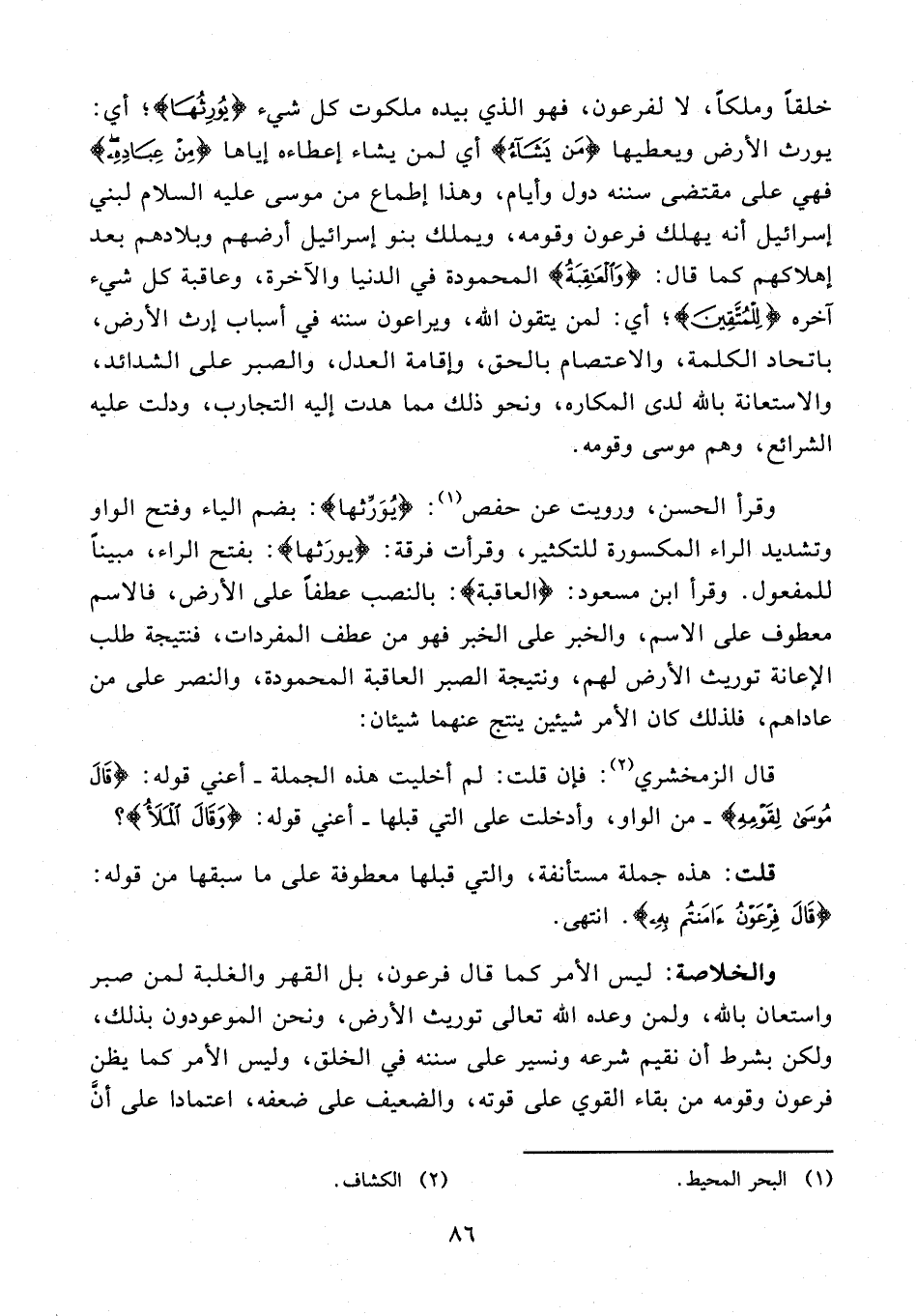 وقرأ الحسن، ورويت عن حفص (¬1): {يورثها}: بضم الياء وفتح الواو وتشديد الراء المكسورة للتكثير، وقرأت فرقة: {يورثها}: بفتح الراء، مبينا للمفعول. وقرأ ابن مسعود: {الْعاقِبَةُ}: بالنصب عطفا على الأرض، فالاسم معطوف على الاسم، والخبر على الخبر فهو من عطف المفردات، فنتيجة طلب الإعانة توريث الأرض لهم، ونتيجة الصبر العاقبة المحمودة، والنصر على من عاداهم، فلذلك كان الأمر شيئين ينتج عنهما شيئان: