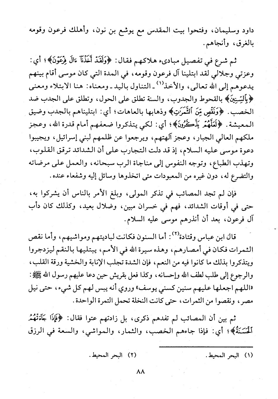 قال ابن عباس وقتادة (¬2): أما السنون فكانت لباديتهم ومواشيهم، وأما نقص الثمرات فكان في أمصارهم، وهذه سيرة الله في الأمم، يبتليها بالنقم ليزدجروا ويتذكروا بذلك ما كانوا فيه من النعم، فإن الشدة تجلب الإنابة والخشية ورقة القلب، والرجوع إلى طلب لطف الله وإحسانه، وكذا فعل بقريش حين دعا عليهم رسول الله صلى الله عليه وسلّم: «اللهم اجعلها عليهم سنين كسني يوسف» وروي أنه يبس لهم كل شيء، حتى نيل مصر، ونقصوا من الثمرات، حتى كانت النخلة تحمل التمرة الواحدة.