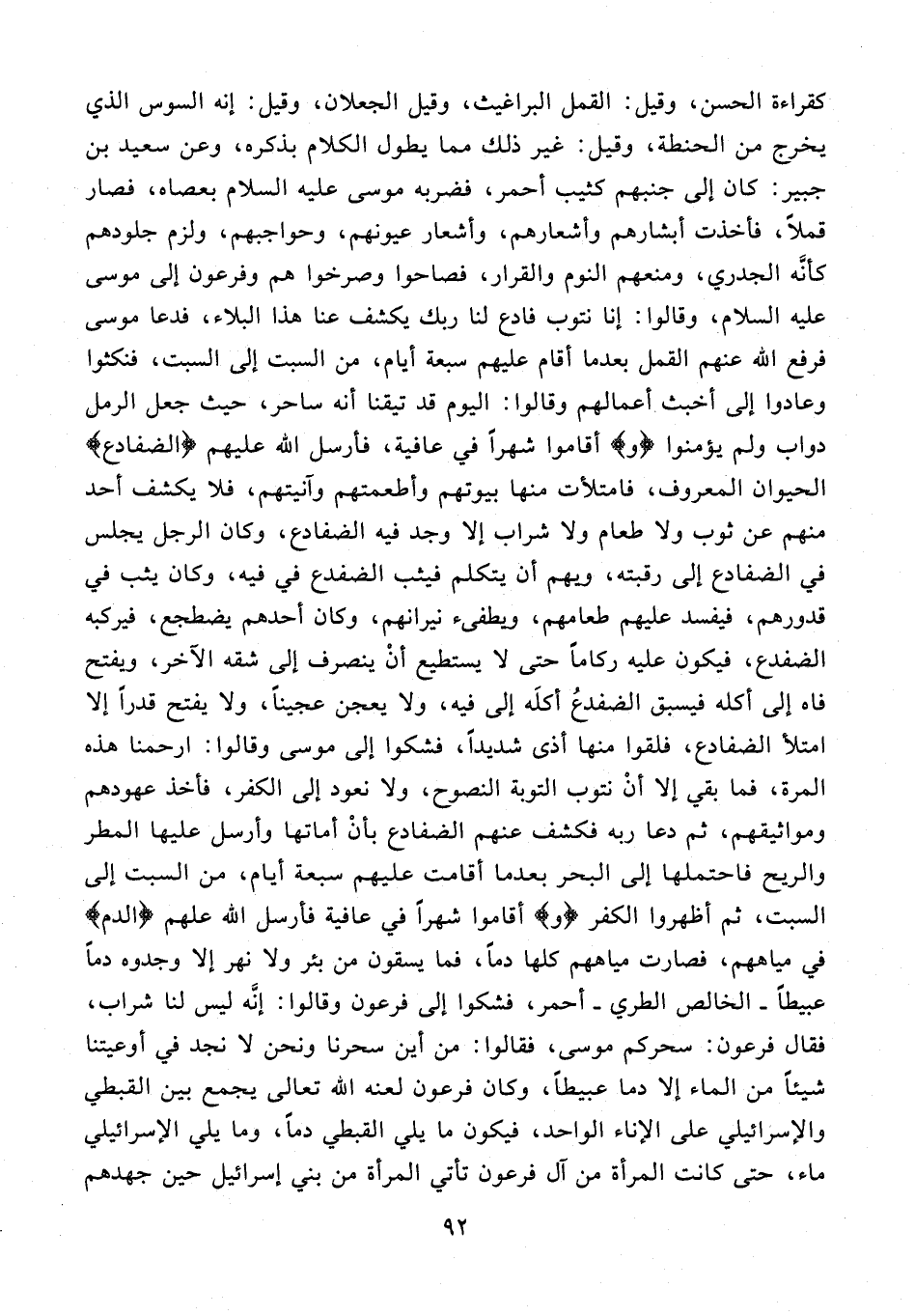 كقراءة الحسن، وقيل: القمل البراغيث، وقيل الجعلان، وقيل: إنه السوس الذي يخرج من الحنطة، وقيل: غير ذلك مما يطول الكلام بذكره، وعن سعيد بن جبير: كان إلى جنبهم كثيب أحمر، فضربه موسى عليه السلام بعصاه، فصار قملا، فأخذت أبشارهم وأشعارهم، وأشعار عيونهم، وحواجبهم، ولزم جلودهم كأنّه الجدري، ومنعهم النوم والقرار، فصاحوا وصرخوا هم وفرعون إلى موسى عليه السلام، وقالوا: إنا نتوب فادع لنا ربك يكشف عنا هذا البلاء، فدعا موسى فرفع الله عنهم القمل بعدما أقام عليهم سبعة أيام، من السبت إلى السبت، فنكثوا وعادوا إلى أخبث أعمالهم وقالوا: اليوم قد تيقنا أنه ساحر، حيث جعل الرمل دواب ولم يؤمنوا {وَ} أقاموا شهرا في عافية، فأرسل الله عليهم {الضَّفادِعَ} الحيوان المعروف، فامتلأت منها بيوتهم وأطعمتهم وآنيتهم، فلا يكشف أحد منهم عن ثوب ولا طعام ولا شراب إلا وجد فيه الضفادع، وكان الرجل يجلس في الضفادع إلى رقبته، ويهم أن يتكلم فيثب الضفدع في فيه، وكان يثب في قدورهم، فيفسد عليهم طعامهم، ويطفىء نيرانهم، وكان أحدهم يضطجع، فيركبه الضفدع، فيكون عليه ركاما حتى لا يستطيع أن ينصرف إلى شقه الآخر، ويفتح فاه إلى أكله فيسبق الضفدع أكله إلى فيه، ولا يعجن عجينا، ولا يفتح قدرا إلا امتلأ الضفادع، فلقوا منها أذى شديدا، فشكوا إلى موسى وقالوا: ارحمنا هذه المرة، فما بقي إلا أن نتوب التوبة النصوح، ولا نعود إلى الكفر، فأخذ عهودهم ومواثيقهم، ثم دعا ربه فكشف عنهم الضفادع بأن أماتها وأرسل عليها المطر والريح فاحتملها إلى البحر بعد ما أقامت عليهم سبعة أيام، من السبت إلى السبت، ثم أظهروا الكفر {وَ} أقاموا شهرا في عافية فأرسل الله عليهم {الدَّمَ} في مياههم، فصارت مياههم كلها دما، فما يسقون من بئر ولا نهر إلا وجدوه دما عبيطا - الخالص الطري - أحمر، فشكوا إلى فرعون وقالوا: إنّه ليس لنا شراب، فقال فرعون: سحركم موسى، فقالوا: من أين سحرنا ونحن لا نجد في أوعيتنا شيئا من الماء إلا دما عبيطا، وكان فرعون لعنه الله تعالى يجمع بين القبطي والإسرائيلي على الإناء الواحد، فيكون ما يلي القبطي دما، وما يلي الإسرائيلي ماء، حتى كانت المرأة من آل فرعون تأتي المرأة من بني إسرائيل حين جهدهم