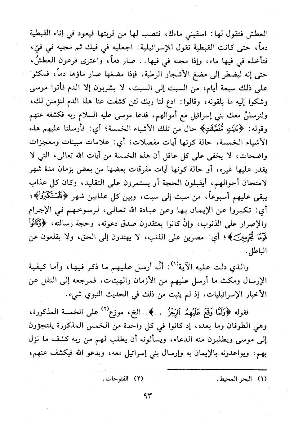 العطش فتقول لها: اسقيني ماءك، فتصب لها من قربتها فيعود في إناء القبطية دما، حتى كانت القبطية تقول للإسرائيلية: اجعليه في فيك ثم مجيه في فيّ، فتأخذه في فيها ماء، وإذا مجته في فيها .. صار دما، واعترى فرعون العطش، حتى إنه ليضطر إلى مضغ الأشجار الرطبة، فإذا مضغها صار ماؤها دما، فمكثوا على ذلك سبعة أيام، من السبت إلى السبت، لا يشربون إلا الدم فأتوا موسى وشكوا إليه ما يلقونه، وقالوا: ادع لنا ربك لئن كشفت عنا هذا الدم لنؤمنن لك، ولنرسلنّ معك بني إسرائيل مع أموالهم، فدعا موسى عليه السلام ربه فكشفه عنهم وقوله: {آياتٍ مُفَصَّلاتٍ} حال من تلك الأشياء الخمسة؛ أي: فأرسلنا عليهم هذه الأشياء الخمسة، حالة كونها آيات مفصلات؛ أي: علامات مبينات ومعجزات واضحات، لا يخفى على كل عاقل أن هذه الخمسة من آيات الله تعالى، التي لا يقدر عليها غيره، أو حالة كونها آيات مفرقات بعضها من بعض بزمان مدة شهر لامتحان أحوالهم، أيقبلون الحجة أو يستمرون على التقليد، وكان كل عذاب يبقى عليهم أسبوعا، من سبت إلى سبت، وبين كل عذابين شهر {فَاسْتَكْبَرُوا}؛ أي: تكبروا عن الإيمان بها وعن عبادة الله تعالى، لرسوخهم في الإجرام والإصرار على الذنوب، وإن كانوا يعتقدون صدق دعوته، وحجة رسالته، {وَكانُوا قَوْمًا مُجْرِمِينَ}؛ أي: مصرين على الذنب، لا يهتدون إلى الحق، ولا يقلعون عن الباطل.