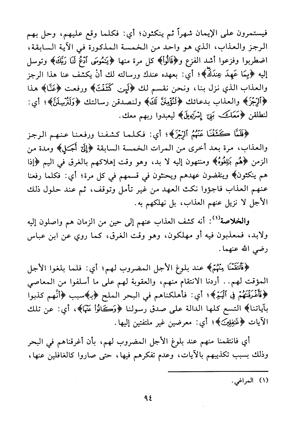 135 - {فَلَمَّا كَشَفْنا عَنْهُمُ الرِّجْزَ}؛ أي: فكلما كشفنا ورفعنا عنهم الرجز والعذاب، مرة بعد أخرى من المرات الخمسة السابقة {إِلى أَجَلٍ} ومدة من الزمن {هُمْ بالِغُوهُ} ومنتهون إليه لا بد، وهو وقت إهلاكهم بالغرق في اليم {إِذا هُمْ يَنْكُثُونَ} وينقضون عهدهم ويحنثون في قسمهم في كل مرة؛ أي: فكلما رفعنا عنهم العذاب فاجؤوا نكث العهد من غير تأمل وتوقف، ثم عند حلول ذلك الأجل لا نزيل عنهم العذاب، بل نهلكهم به.