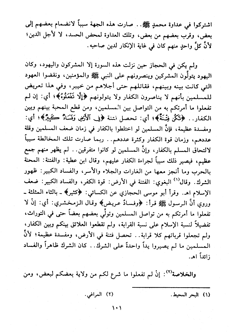 ولم يكن في الحجاز حين نزلت هذه السورة إلا المشركون واليهود، وكان اليهود يتولَّون المشركين وينصرونهم على النبي - صلى الله عليه وسلم - والمؤمنين، ونقضوا العهود التي كانت بينه وبينهم، فقاتلهم حتى أجلاهم من خيبر، وفي هذا تعريض للمسلمين بأنهم لا يناصرون الكفار ولا يتولونهم {إِلَّا تَفْعَلُوهُ}؛ أي: إن لم تفعلوا ما أمرتكم به من التواصل بين المسلمين، ومن قطع المحبة بينهم وبين الكفار .. {تَكُنْ فِتْنَةٌ}؛ أي: تحصل فتنة {فِي الْأَرْضِ وَفَسَادٌ كَبِيرٌ}؛ أي: ومفسدة عظيمة، فإنَّ المسلمين لو اختلطوا بالكفار في زمان ضعف المسلمين وقلة عددهم، وزمان قوة الكفار وكثرة عددهم .. ربما صارت تلك المخالطة سببًا لالتحاق المسلم بالكفار، وإنَّ المسلمين لو كانوا متفرقين .. لم يظهر منهم جمع عظيم، فيصير ذلك سببًا لجراءة الكفار عليهم، وقال ابن عطية: والفتنة: المحنة بالحرب وما أنجز معها من الغارات والجلاء والأسر، والفساد الكبير: ظهور الشرك. وقال (¬1) البغوي: الفتنة في الأرض: قوة الكفر، والفساد الكبير: ضعف الإسلام اهـ. وقرأ أبو موسى الحجازي عن الكسائي: {كثير} - بالثاء المثلثة - وروي أنَّ الرسول - صلى الله عليه وسلم - قرأ: {وفسادٌ عريض} وقال الزمخشري: أي: إنْ لا تفعلوا ما أمرتكم به من تواصل المسلمين وتولي بعضهم بعضًا حتى في التورث، تفضيلًا لنسبة الإِسلام على نسبة القرابة، ولم تقطعوا العلائق بينكم وبين الكفار، ولم تجعلوا قرباتهم كلا قرابة .. تحصل فتنة في الأرض، ومفسدة عظيمة؛ لأنَّ المسلمين ما لم يصيروا يدًا واحدةً على الشرك .. كان الشرك ظاهرًا والفساد زائدًا اهـ.