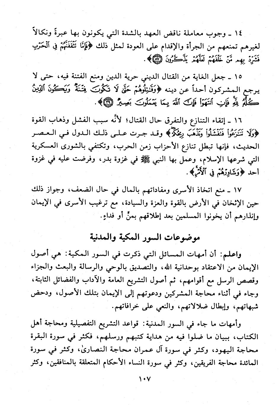 16 - إتقاء التنازع والتفرق حال القتال؛ لأنَّه سبب الفشل وذهاب القوة {وَلَا تَنَازَعُوا فَتَفْشَلُوا وَتَذْهَبَ رِيحُكُمْ} وقد جرت على ذلك الدول في العصر الحديث، فإنها تبطل تنازع الأحزاب زمن الحرب، وتكتفي بالشورى العسكرية التي شرعها الإِسلام، وعمل بها النبي - صلى الله عليه وسلم - في غزوة بدر، وفرضت عليه في غزوة أحد {وَشَاوِرْهُمْ فِي الْأَمْرِ}.