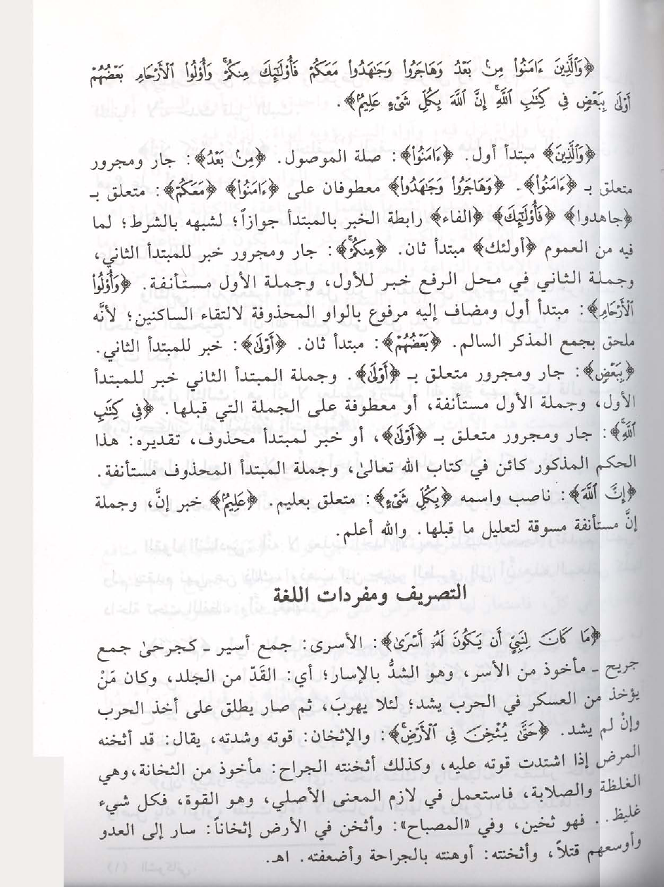 {وَالَّذِينَ} مبتدأ أول. {آمَنُوا}: صلة الموصول. {مِنْ بَعْدُ}: جار ومجرور متعلق بـ {آمَنُوا} {وَهَاجَرُوا وَجَاهَدُوا} معطوفان على {آمَنُوا} {مَعَكُمْ} متعلق بـ {وَجَاهَدُوا} {فَأُولَئِكَ} {الفاء} رابطة الخبر بالمبتدأ جوازًا لشبهه بالشرط؛ لما فيه من العموم {أولئك} مبتدأ ثان. {مِنْكُمْ}: جار ومجرور خبر للمبتدأ الثاني، وجملة الثاني في محل الرفع خبر للأول، وجملة الأول مستأنفة. {وَأُولُو الْأَرْحَامِ}: مبتدأ أول ومضاف إليه مرفوع بالواو المحذوفة لالتقاء الساكنين؛ لأنَّه ملحق بجمع المذكر السالم. {بَعْضُهُمْ}: مبتدأ ثان. {أَوْلَى}: خبر للمبتدأ الثاني. {بِبَعْضٍ}: جار ومجرور متعلق بـ {أَوْلَى}. وجملة المبتدأ الثاني خبر للمبتدأ الأول، وجملة الأول مستأنفة، أو معطوفة على الجملة التي قبلها. {فِي كِتَابِ اللَّهِ}: جار ومجرور متعلق بـ {أَوْلَى}، أو خبر لمبتدأ محذوف، تقديره: هذا الحكم المذكور كائن في كتاب الله تعالى، وجملة المبتدأ المحذوف مستأنفة. {إِنَّ اللَّهَ}: ناصب واسمه {بِكُلِّ شَيْءٍ}: متعلق بعليم. {عَلِيمٌ} خبر إنَّ، وجملة إنَّ مستأنفة مسوقة لتعليل ما قبلها. والله أعلم.