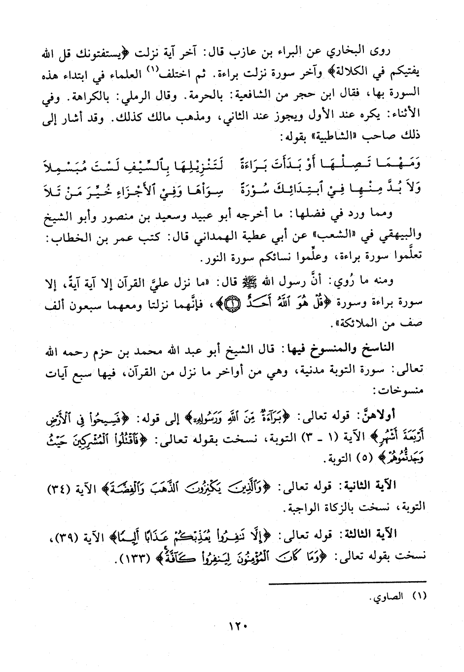 الناسخ والمنسوخ فيها: قال الشيخ أبو عبد الله محمَّد بن حزم رحمه الله تعالى: سورة التوبة مدنية، وهي من أواخر ما نزل من القرآن، فيها سبع آيات منسوخات: