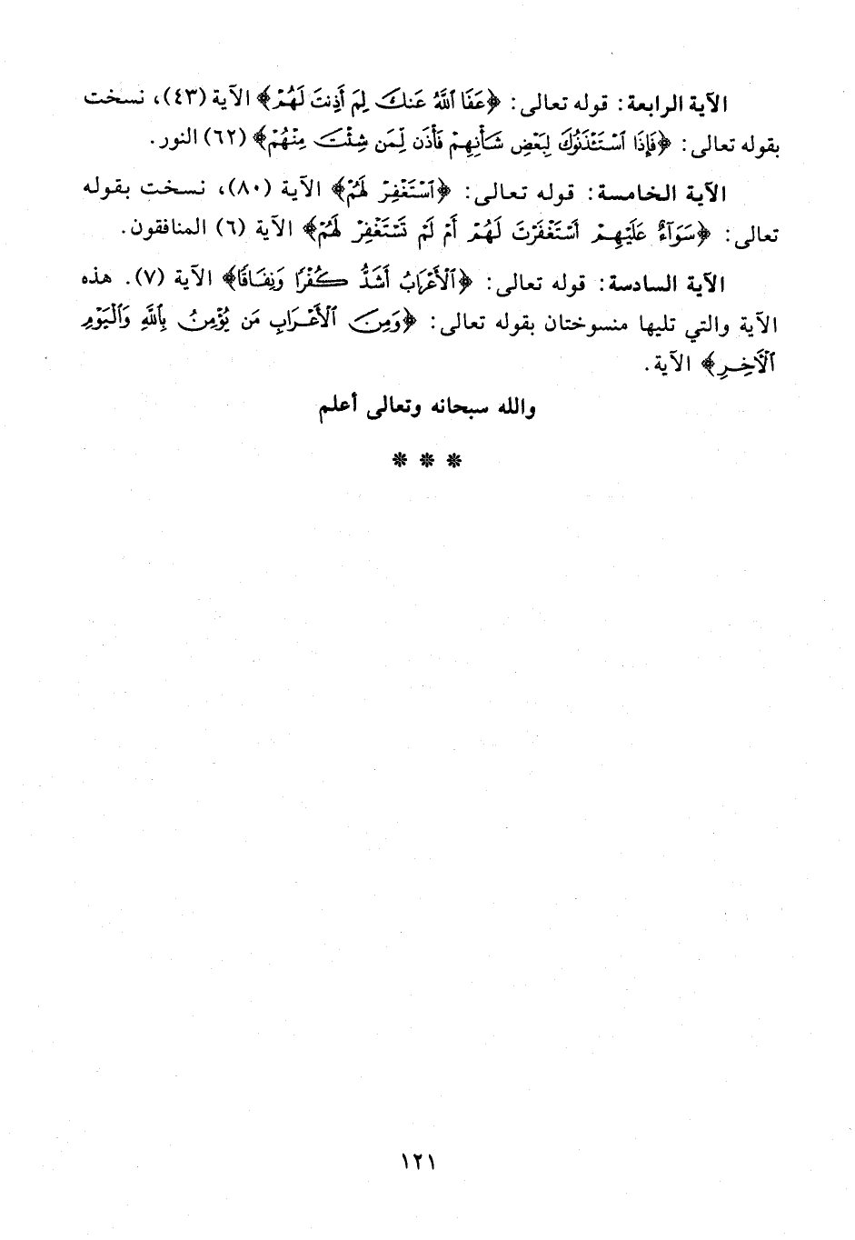 الآية السادسة: قوله تعالى: {الْأَعْرَابُ أَشَدُّ كُفْرًا وَنِفَاقًا} الآية (97). هذه الآية والتي تليها منسوختان بقوله تعالى: {وَمِنَ الْأَعْرَابِ مَنْ يُؤْمِنُ بِاللَّهِ وَالْيَوْمِ الْآخِرِ} الآية.
