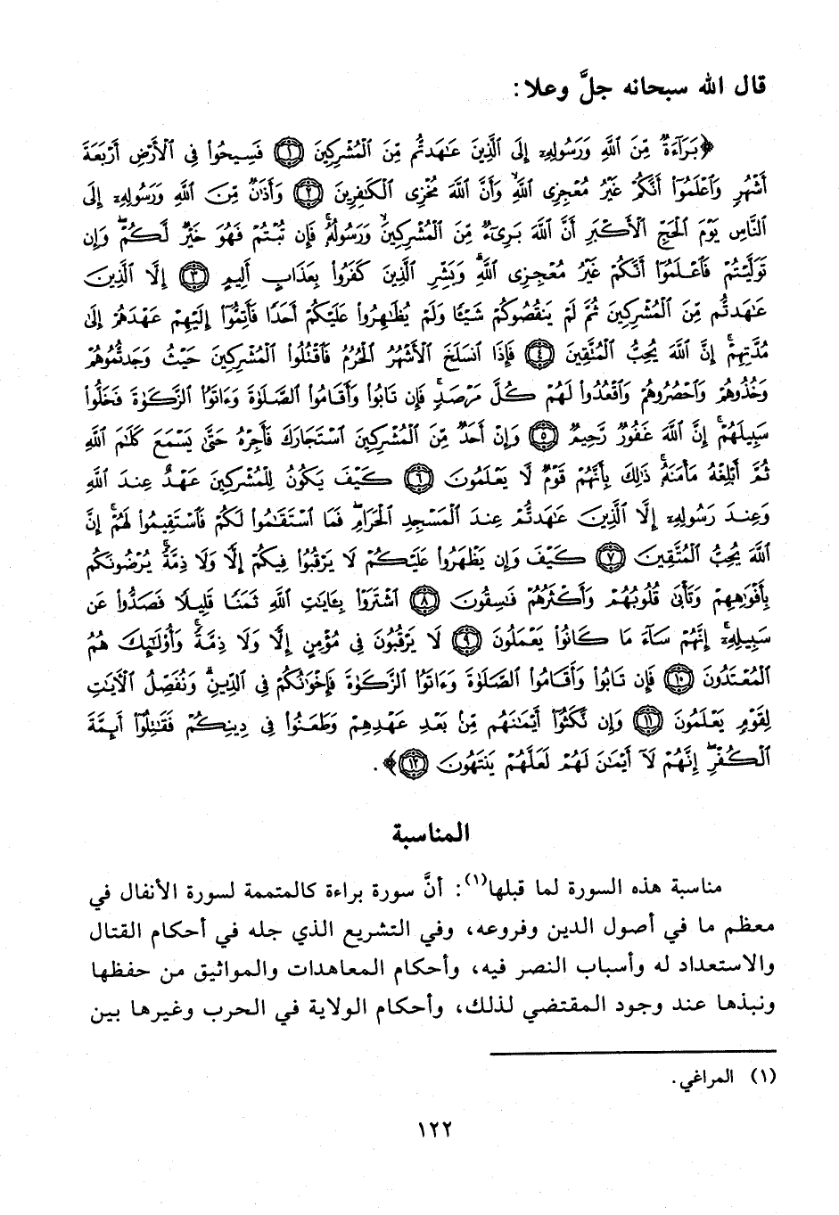 {بَرَاءَةٌ مِنَ اللَّهِ وَرَسُولِهِ إِلَى الَّذِينَ عَاهَدْتُمْ مِنَ الْمُشْرِكِينَ (1) فَسِيحُوا فِي الْأَرْضِ أَرْبَعَةَ أَشْهُرٍ وَاعْلَمُوا أَنَّكُمْ غَيْرُ مُعْجِزِي اللَّهِ وَأَنَّ اللَّهَ مُخْزِي الْكَافِرِينَ (2) وَأَذَانٌ مِنَ اللَّهِ وَرَسُولِهِ إِلَى النَّاسِ يَوْمَ الْحَجِّ الْأَكْبَرِ أَنَّ اللَّهَ بَرِيءٌ مِنَ الْمُشْرِكِينَ وَرَسُولُهُ فَإِنْ تُبْتُمْ فَهُوَ خَيْرٌ لَكُمْ وَإِنْ تَوَلَّيْتُمْ فَاعْلَمُوا أَنَّكُمْ غَيْرُ مُعْجِزِي اللَّهِ وَبَشِّرِ الَّذِينَ كَفَرُوا بِعَذَابٍ أَلِيمٍ (3) إِلَّا الَّذِينَ عَاهَدْتُمْ مِنَ الْمُشْرِكِينَ ثُمَّ لَمْ يَنْقُصُوكُمْ شَيْئًا وَلَمْ يُظَاهِرُوا عَلَيْكُمْ أَحَدًا فَأَتِمُّوا إِلَيْهِمْ عَهْدَهُمْ إِلَى مُدَّتِهِمْ إِنَّ اللَّهَ يُحِبُّ الْمُتَّقِينَ (4) فَإِذَا انْسَلَخَ الْأَشْهُرُ الْحُرُمُ فَاقْتُلُوا الْمُشْرِكِينَ حَيْثُ وَجَدْتُمُوهُمْ وَخُذُوهُمْ وَاحْصُرُوهُمْ وَاقْعُدُوا لَهُمْ كُلَّ مَرْصَدٍ فَإِنْ تَابُوا وَأَقَامُوا الصَّلَاةَ وَآتَوُا الزَّكَاةَ فَخَلُّوا سَبِيلَهُمْ إِنَّ اللَّهَ غَفُورٌ رَحِيمٌ (5) وَإِنْ أَحَدٌ مِنَ الْمُشْرِكِينَ اسْتَجَارَكَ فَأَجِرْهُ حَتَّى يَسْمَعَ كَلَامَ اللَّهِ ثُمَّ أَبْلِغْهُ مَأْمَنَهُ ذَلِكَ بِأَنَّهُمْ قَوْمٌ لَا يَعْلَمُونَ (6) كَيْفَ يَكُونُ لِلْمُشْرِكِينَ عَهْدٌ عِنْدَ اللَّهِ وَعِنْدَ رَسُولِهِ إِلَّا الَّذِينَ عَاهَدْتُمْ عِنْدَ الْمَسْجِدِ الْحَرَامِ فَمَا اسْتَقَامُوا لَكُمْ فَاسْتَقِيمُوا لَهُمْ إِنَّ اللَّهَ يُحِبُّ الْمُتَّقِينَ (7) كَيْفَ وَإِنْ يَظْهَرُوا عَلَيْكُمْ لَا يَرْقُبُوا فِيكُمْ إِلًّا وَلَا ذِمَّةً يُرْضُونَكُمْ بِأَفْوَاهِهِمْ وَتَأْبَى قُلُوبُهُمْ وَأَكْثَرُهُمْ فَاسِقُونَ (8) اشْتَرَوْا بِآيَاتِ اللَّهِ ثَمَنًا قَلِيلًا فَصَدُّوا عَنْ سَبِيلِهِ إِنَّهُمْ سَاءَ مَا كَانُوا يَعْمَلُونَ (9) لَا يَرْقُبُونَ فِي مُؤْمِنٍ إِلًّا وَلَا ذِمَّةً وَأُولَئِكَ هُمُ الْمُعْتَدُونَ (10) فَإِنْ تَابُوا وَأَقَامُوا الصَّلَاةَ وَآتَوُا الزَّكَاةَ فَإِخْوَانُكُمْ فِي الدِّينِ وَنُفَصِّلُ الْآيَاتِ لِقَوْمٍ يَعْلَمُونَ (11) وَإِنْ نَكَثُوا أَيْمَانَهُمْ مِنْ بَعْدِ عَهْدِهِمْ وَطَعَنُوا فِي دِينِكُمْ فَقَاتِلُوا أَئِمَّةَ الْكُفْرِ إِنَّهُمْ لَا أَيْمَانَ لَهُمْ لَعَلَّهُمْ يَنْتَهُونَ (12)}.