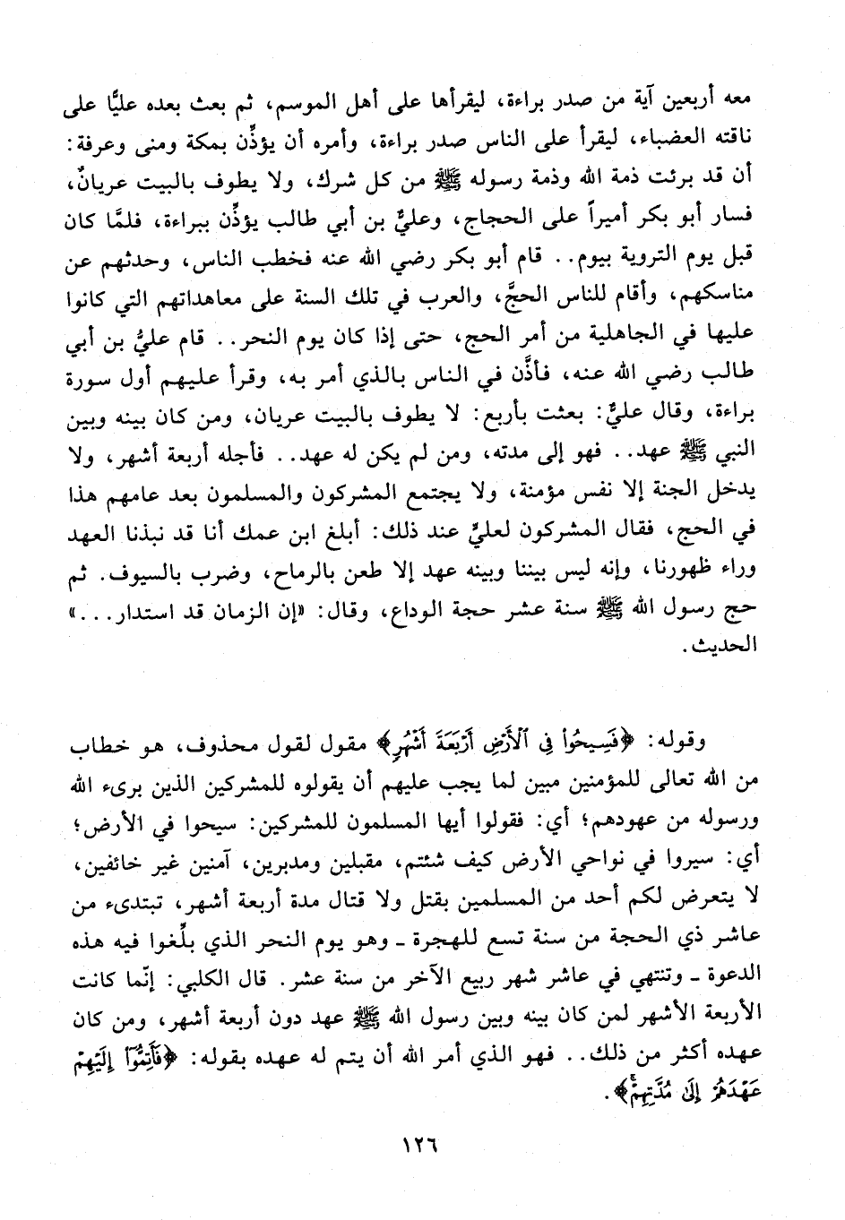 معه أربعين آية من صدر براءة، ليقرأها على أهل الموسم، ثم بعث بعده عليًّا على ناقته العضباء، ليقرأ على الناس صدر براءة، وأمره أن يؤذِّن بمكة ومنى وعرفة: أن قد برئت ذمة الله وذمة رسوله - صلى الله عليه وسلم - من كل شرك، ولا يطوف بالبيت عريانٌ، فسار أبو بكر أميرًا على الحجاج، وعليٌّ بن أبي طالب يؤذِّن ببراءة، فلمَّا كان قبل يوم التروية بيوم .. قام أبو بكر رضي الله عنه فخطب الناس، وحدثهم عن مناسكهم، وأقام للناس الحجَّ، والعرب في تلك السنة على معاهداتهم التي كانوا عليها في الجاهلية من أمر الحج، حتى إذا كان يوم النحر .. قام عليُّ بن أبي طالب رضي الله عنه، فأذَّن في الناس بالذي أمر به، وقرأ عليهم أول سورة براءة، وقال عليٌّ: بعثت بأربع: لا يطوف بالبيت عريان، ومن كان بينه وبين النبي - صلى الله عليه وسلم - عهد .. فهو إلى مدته، ومن لم يكن له عهد .. فأجله أربعة أشهر، ولا يدخل الجنة إلا نفس مؤمنة، ولا يجتمع المشركون والمسلمون بعد عامهم هذا في الحج، فقال المشركون لعليٍّ عند ذلك: أبلغ ابن عمك أنا قد نبذنا العهد وراء ظهورنا، وإنه ليس بيننا وبينه عهد إلا طعن بالرماح، وضرب بالسيوف. ثم حج رسول الله - صلى الله عليه وسلم - سنة عشر حجة الوداع، وقال: "إن الزمان قد استدار ... " الحديث.