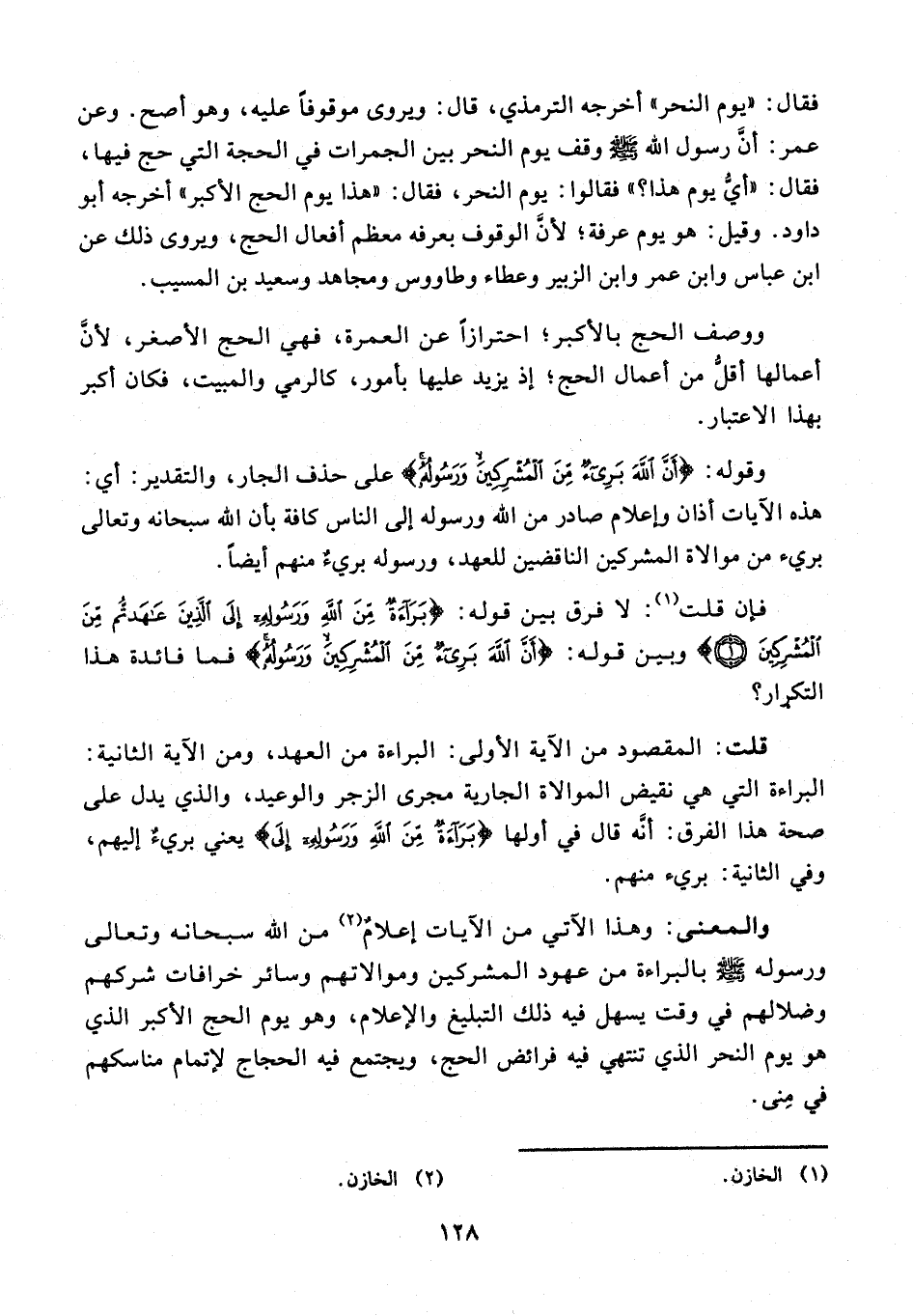 والمعنى: وهذا الآتي من الآيات إعلامٌ (¬2) من الله سبحانه وتعالى ورسوله - صلى الله عليه وسلم - بالبراءة من عهود المشركين وموالاتهم وسائر خرافات شركهم وضلالهم في وقت يسهل فيه ذلك التبليغ والإعلام، وهو يوم الحج الأكبر الذي هو يوم النحر الذي تنتهي فيه فرائض الحج، ويجتمع فيه الحجاج لإتمام مناسكهم في مِنى.
