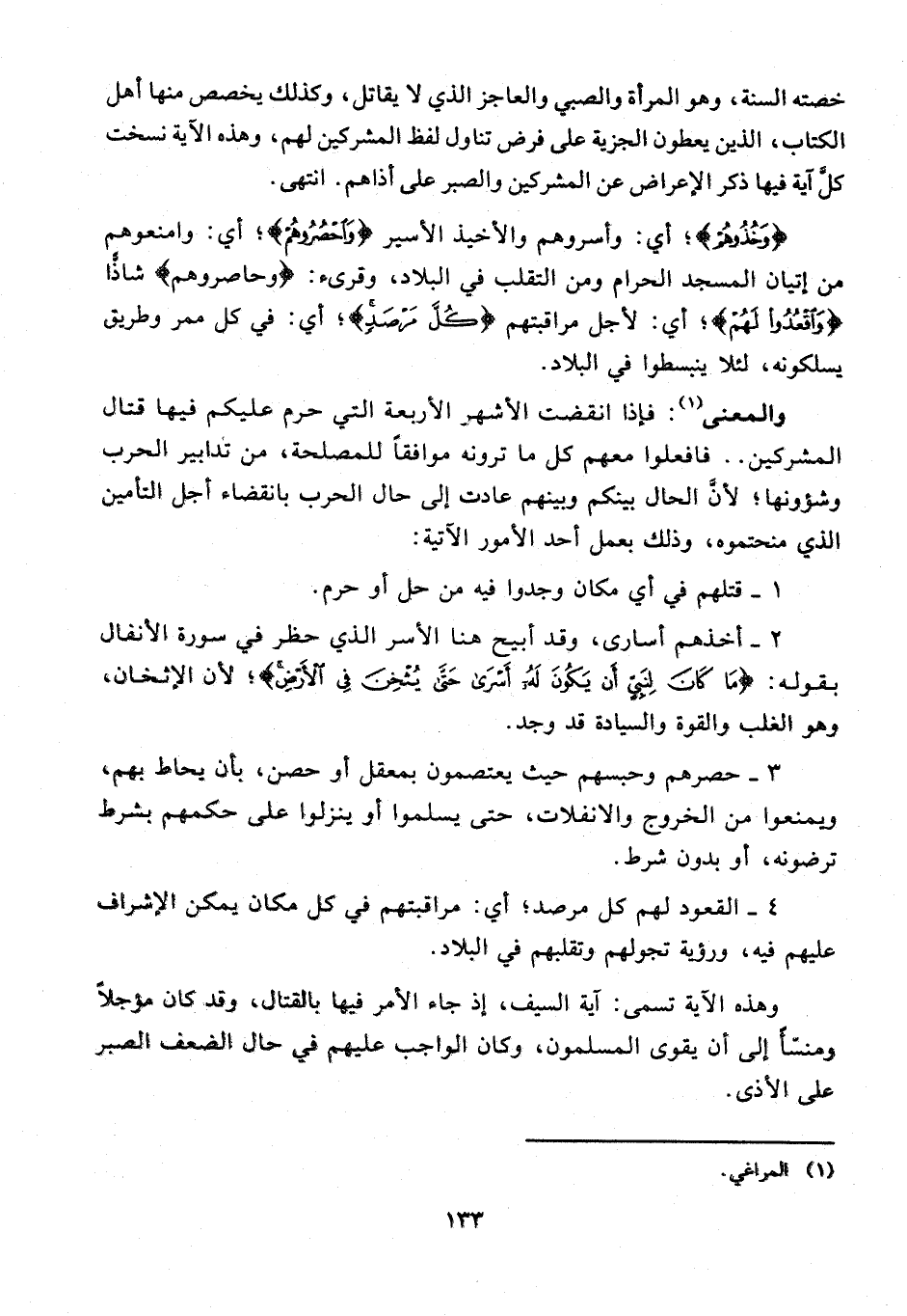 والمعنى (¬1): فإذا انقضت الأشهر الأربعة التي حرم عليكم فيها قتال المشركين .. فافعلوا معهم كل ما ترونه موافقًا للمصلحة، من تدابير الحرب وشؤونها؛ لأنَّ الحال بينكم وبينهم عادت إلى حال الحرب بانقضاء أجل التأمين الذي منحتموه، وذلك بعمل أحد الأمور الآتية: