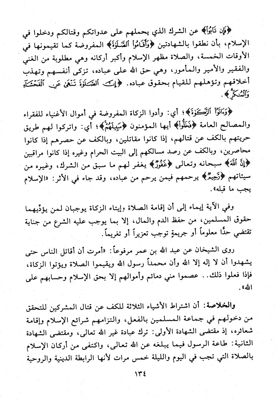 والخلاصة: أن اشتراط الأشياء الثلاثة للكف عن قتال المشركين للتحقق من دخولهم في جماعة المسلمين بالفعل، والتزامهم شرائع الإِسلام وإقامة شعائره، إذ مقتضى الشهادة الأولى: ترك عبادة غير الله تعالى، ومقتضى الشهادة الثانية: طاعة الرسول فيما يبلغه عن الله تعالى، واكتفى من أركان الإِسلام بالصلاة التي تجب في اليوم والليلة خمس مرات لأنها الرابطة الدينية والروحية