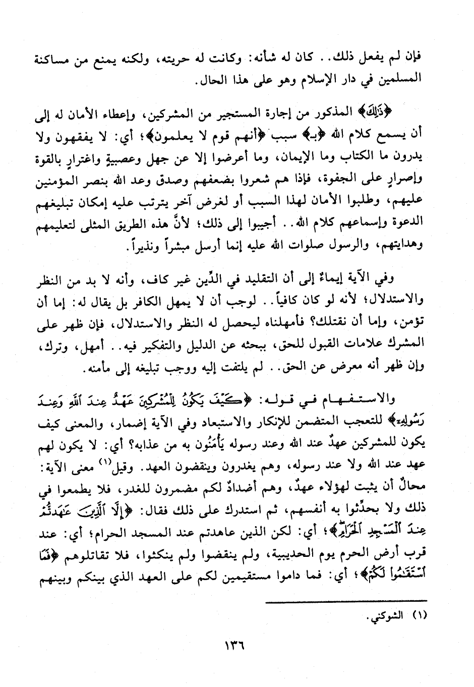 وفي الآية إيماءٌ إلى أن التقليد في الدِّين غير كاف، وأنه لا بد عن النظر والاستدلال؛ لأنه لو كان كافيًا .. لوجب أن لا يمهل الكافر بل يقال له: إما أن تؤمن، وإما أن نقتلك؟ فأمهلناه ليحصل له النظر والاستدلال، فإن ظهر على المشرك علامات القبول للحق، ببحثه عن الدليل والتفكير فيه .. أمهل، وترك، وإن ظهر أنه معرض عن الحق .. لم يلتفت إليه ووجب تبليغه إلى مأمنه.