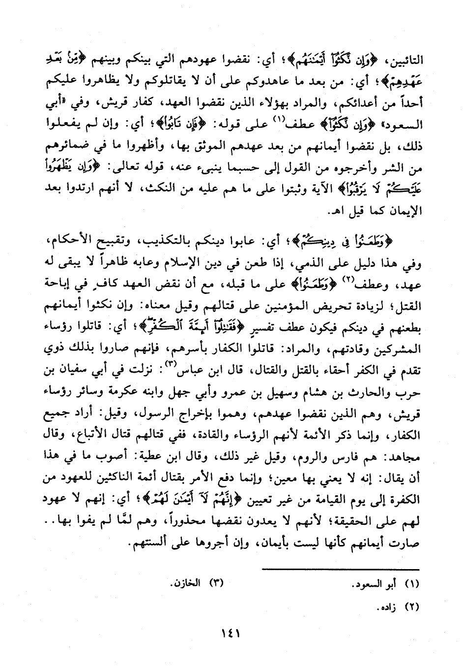 {وَطَعَنُوا فِي دِينِكُمْ}؛ أي: عابوا دينكم بالتكذيب، وتقبيح الأحكام، وفي هذا دليل على الذمي، إذا طعن في دين الإِسلام وعابه ظاهرًا لا يبقى له عهد، وعطف (¬2) {وَطَعَنُوا} على ما قبله، مع أن نقض العهد كافٍ في إباحة القتل؛ لزيادة تحريض المؤمنين على قتالهم وقيل معناه: وإن نكثوا أيمانهم بطعنهم في دينكم فيكون عطف تفسيرٍ {فَقَاتِلُوا أَئِمَّةَ الْكُفْرِ}؛ أي: قاتلوا رؤساء المشركين وقادتهم، والمراد: قاتلوا الكفار بأسرهم، فإنهم صاروا بذلك ذوي تقدم في الكفر أحقاء بالقتل والقتال، قال ابن عباس (¬3): نزلت في أبي سفيان بن حرب والحارث بن هشام وسهيل بن عمرو وأبي جهل وابنه عكرمة وسائر رؤساء قريش، وهم الذين نقضوا عهدهم، وهموا بإخراج الرسول، وقيل: أراد جميع الكفار، وإنما ذكر الأئمة لأنهم الرؤساء والقادة، ففي قتالهم قتال الأتباع، وقال مجاهد: هم فارس والروم، وقل غير ذلك، وقال ابن عطية: أصوب ما في هذا أن يقال: إنه لا يعني بها معين؛ وإنما دفع الأمر بقتال أئمة الناكثين للعهود من الكفرة إلى يوم القيامة من غير تعيين {إِنَّهُمْ لَا أَيْمَانَ لَهُمْ}؛ أي: إنهم لا عهود لهم على الحقيقة؛ لأنهم لا يعدون نقضها محذورًا، وهم لمَّا لم يفوا بها .. صارت أيمانهم كأنها ليست بأيمان، وإن أجروها على ألسنتهم.