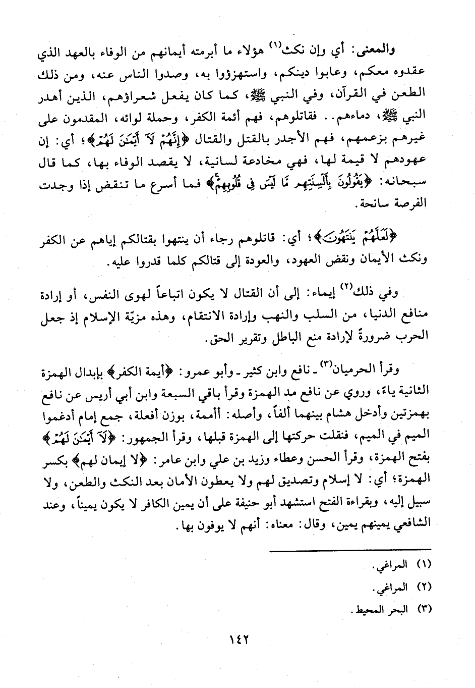 وقرأ الحرميان (¬3) - نافع وابن كثير - وأبو عمرو: {أيمة الكفر} بإبدال الهمزة الثانية ياءً، وروي عن نافع مد الهمزة وقرأ باقي السبعة وابن أبي أريس عن نافع بهمزتين وأدخل هشام بينهما ألفًا، وأصله: أأممة، بوزن أفعلة، جمع إمام أدغموا الميم في الميم، فنقلت حركتها إلى الهمزة قبلها، وقرأ الجمهور: {لَا أَيْمَانَ لَهُمْ} بفتح الهمزة، وقرأ الحسن وعطاء وزيد بن علي وابن عامر: {لا إيمان لهم} بكسر الهمزة؛ أي: لا إسلام وتصديق لهم ولا يعطون الأمان بعد النكث والطعن، ولا سبيل إليه، وبقراءة الفتح استشهد أبو حنيفة على أن يمين الكافر لا يكون يمينًا، وعند الشافعي يمينهم يمين، وقال: معناه: أنهم لا يوفون بها.