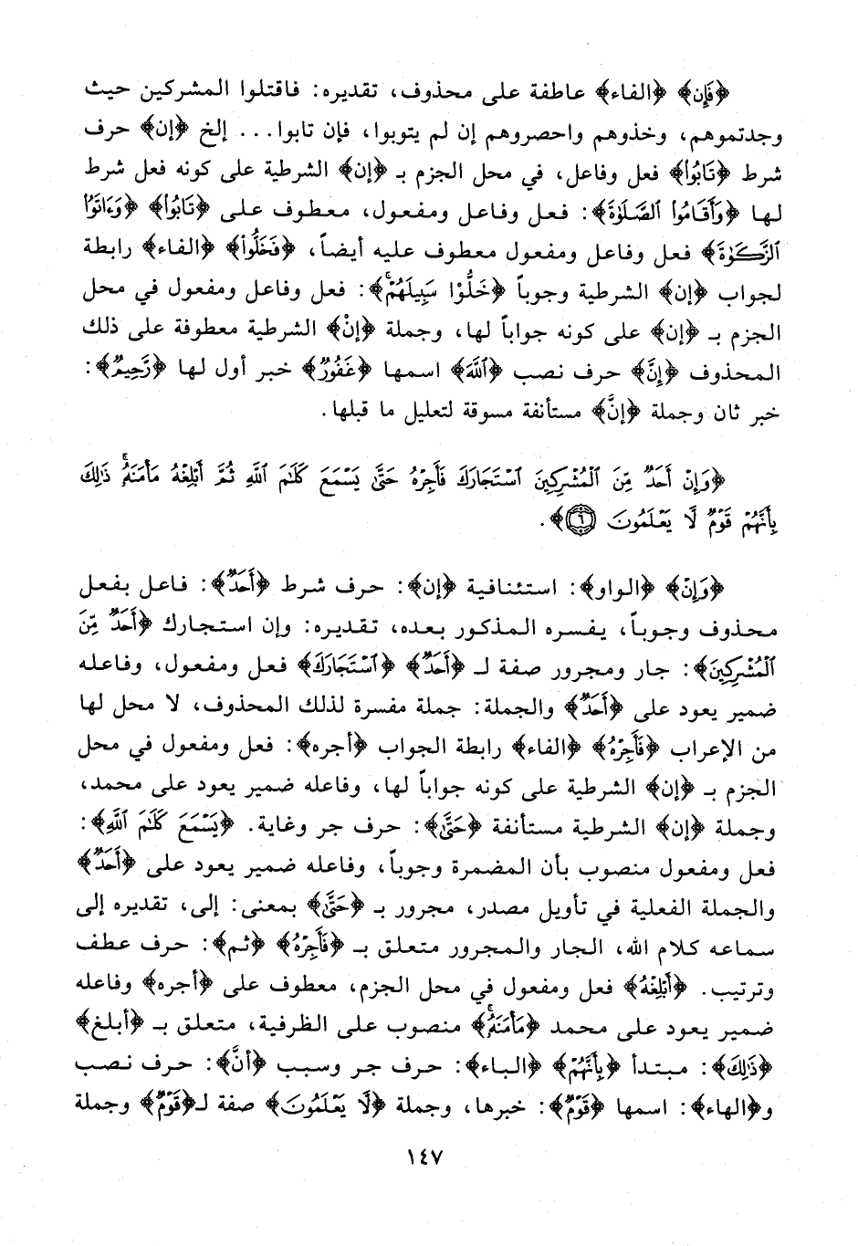 {وَإِنْ} {الواو}: استئنافية {إن}: حرف شرط {أَحَدٌ}: فاعل بفعل محذوف وجوبًا، يفسره المذكور بعده، تقديره: وإن استجارك {أَحَدٌ مِنَ الْمُشْرِكِينَ}: جار ومجرور صفة لـ {أَحَدٌ} {اسْتَجَارَكَ} فعل ومفعول، وفاعله ضمير يعود على {أَحَدٌ} والجملة: جملة مفسرة لذلك المحذوف، لا محل لها من الإعراب {فَأَجِرْهُ} {الفاء} رابطة الجواب {أجره}: فعل ومفعول في محل الجزم بـ {إن} الشرطية على كونه جوابًا لها، وفاعله ضمير يعود على محمَّد، وجملة {إن} الشرطية مستأنفة {حَتَّى}: حرف جر وغاية. {يَسْمَعَ كَلَامَ اللَّهِ}: فعل ومفعول منصوب بأن المضمرة وجوبًا، وفاعله ضمير يعود على {أَحَدٌ} والجملة الفعلية في تأويل مصدر، مجرور بـ {حَتَّى} بمعنى: إلى، تقديره إلى سماعه كلام الله، الجار والمجرور متعلق بـ {فَأَجِرْهُ} {ثم}: حرف عطف وترتيب. {أَبْلِغْهُ} فعل ومفعول في محل الجزم، معطوف على {أجره} وفاعله ضمير يعود على محمَّد {مَأْمَنَهُ} منصوب على الظرفية، متعلق بـ {أبلغ} {ذَلِكَ}: مبتدأ {بِأَنَّهُمْ} {الباء}: حرف جر وسبب {أنَّ}: حرف نصب و {الهاء}: اسمها {قَوْمٌ}: خبرها، وجملة {لَا يَعْلَمُونَ} صفة لـ {قَوْمٌ} وجملة