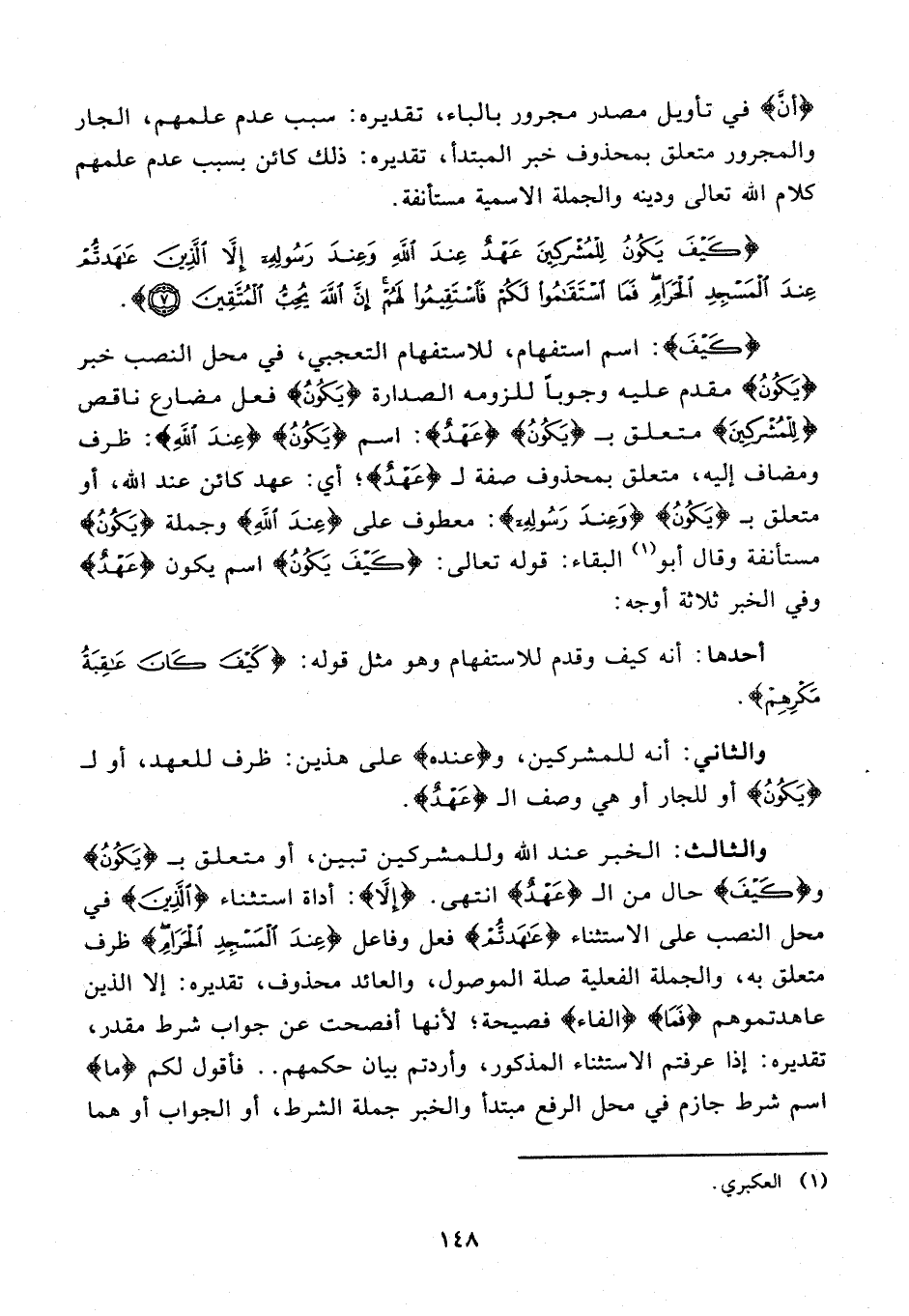 {كَيْفَ}: اسم استفهام, للاستفهام التعجبي، في محل النصب خبر {يَكُونُ} مقدم عليه وجوبًا للزومه الصدارة {يَكُونُ} فعل مضارع ناقص {لِلْمُشْرِكِينَ} متعلق بـ {يَكُونُ} {عَهْدٌ}: اسم {يَكُونُ} {عِنْدَ اللَّهِ}: ظرف ومضاف إليه، متعلق بمحذوف صفة لـ {عَهْدٌ}؛ أي: عهد كائن عند الله، أو متعلق بـ {يَكُونُ} {وَعِنْدَ رَسُولِهِ}: معطوف على {عِنْدَ اللَّهِ} وجملة {يَكُونُ} مستأنفة وقال أبو (¬1) البقاء: قوله تعالى: {كَيْفَ يَكُونُ} اسم يكون {عَهْدٌ} وفي الخبر ثلاثة أوجه: