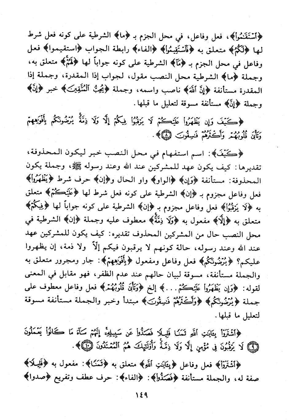 {اسْتَقَامُوا}، فعل وفاعل، في محل الجزم بـ {ما} الشرطية على كونه فعل شرط لها {لَكُمْ}، متعلق به {فَاسْتَقِيمُوا} {الفاء} رابطة الجواب {استقيموا} فعل وفاعل في محل الجزم بـ {مَا} الشرطية على كونه جوابًا لها {لَهُمْ} متعلق به، وجملة {ما} الشرطية محل النصب مقول، لجواب إذا المقدرة، وجملة إذا المقدرة مستأنفة {إِنَّ اللَّهَ} ناصب واسمه، وجملة {يُحِبُّ الْمُتَّقِينَ} خبر {إِنَّ} وجملة {إِنَّ} مستأنفة مسوقة لتعليل ما قبلها.