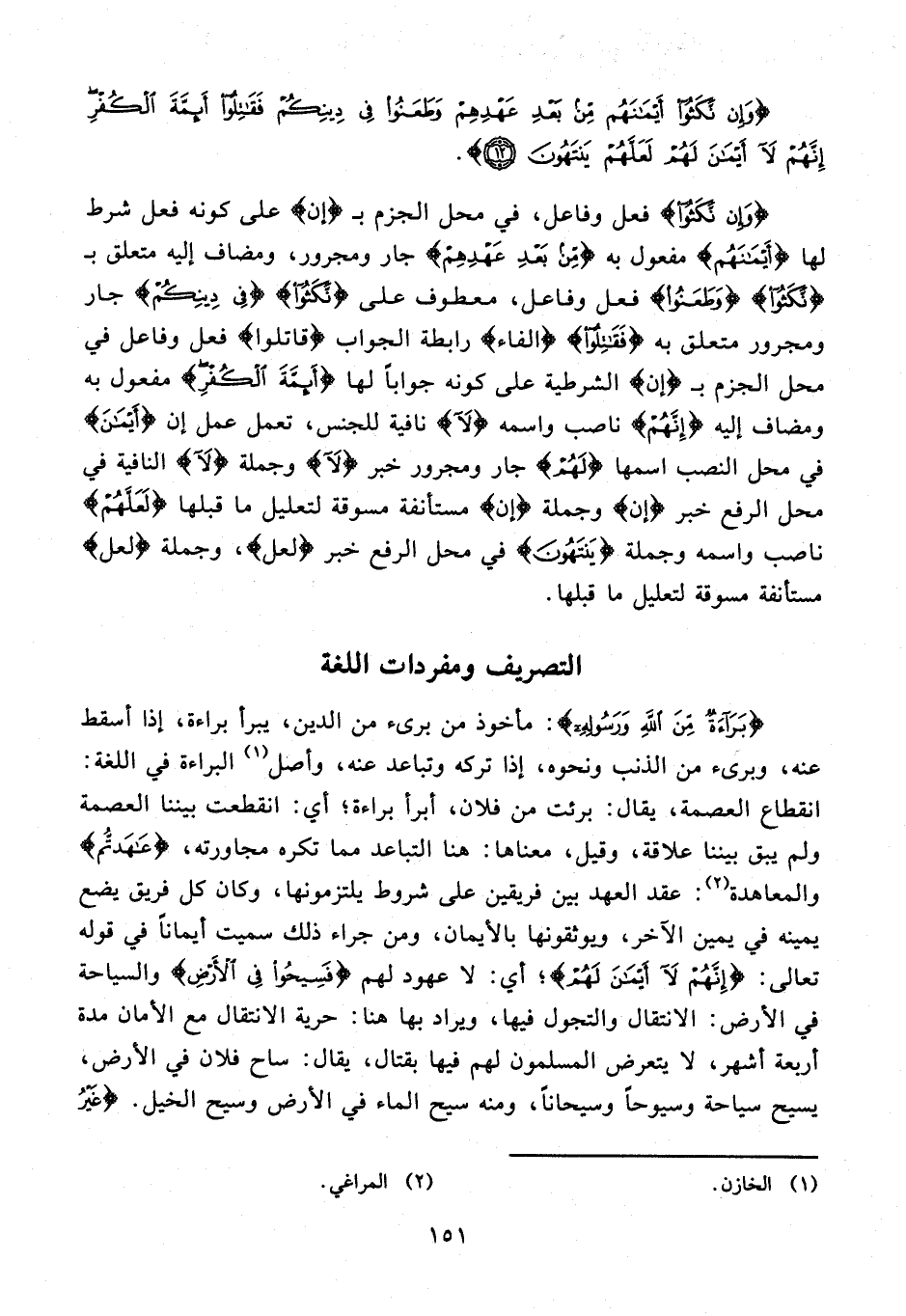 {بَرَاءَةٌ مِنَ اللَّهِ وَرَسُولِهِ}: مأخوذ من برىء من الدين، يبرأ براءة، إذا أسقط عنه، وبرىء من الذنب ونحوه، إذا تركه وتباعد عنه، وأصل (¬1) البراءة في اللغة: انقطاع العصمة، يقال: برئت من فلان، أبرأ براءة؛ أي: انقطعت بيننا العصمة ولم يبق بيننا علاقة، وقيل، معناها: هنا التباعد مما تكره مجاورته، {عَاهَدْتُمْ} والمعاهدة (¬2): عقد العهد بين فريقين على شروط يلتزمونها، وكان كل فريق يضع يمينه في يمين الآخر، ويوثقونها بالأيمان، ومن جراء ذلك سميت أيمانًا في قوله تعالى: {إِنَّهُمْ لَا أَيْمَانَ لَهُمْ}؛ أي: لا عهود لهم {فَسِيحُوا فِي الْأَرْضِ} والسياحة في الأرض: الانتقال والتجول فيها، ويراد بها هنا: حرية الانتقال مع الأمان مدة أربعة أشهر، لا يتعرض المسلمون لهم فيها بقتال، يقال: ساح فلان في الأرض، يسيح سياحة وسيوحًا وسيحانًا، ومنه سيح الماء في الأرض وسيح الخيل. {غَيْرُ