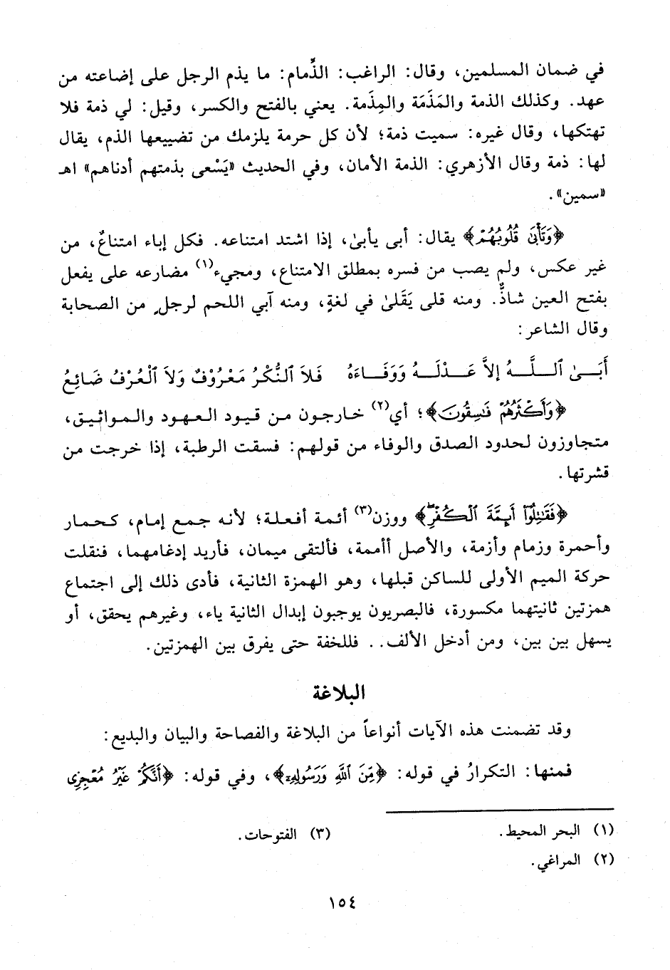 {وَتَأْبَى قُلُوبُهُمْ} يقال: أبي يأبى، إذا اشتد امتناعه. فكل إباء امتناعٌ، من غير عكس، ولم يصب من فسره بمطلق الامتناع، ومجيء (¬1) مضارعه على يفعل بفتح العين شاذٌّ. ومنه قلى يَقَلى في لغةٍ، ومنه آبي اللحم لرجلٍ من الصحابة وقال الشاعر: