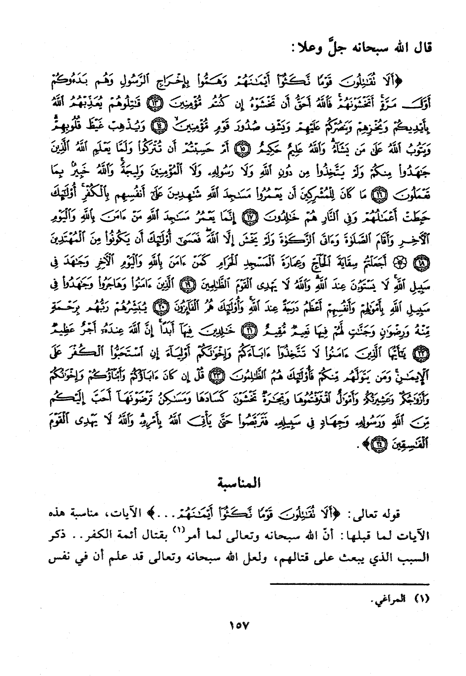 {أَلَا تُقَاتِلُونَ قَوْمًا نَكَثُوا أَيْمَانَهُمْ وَهَمُّوا بِإِخْرَاجِ الرَّسُولِ وَهُمْ بَدَءُوكُمْ أَوَّلَ مَرَّةٍ أَتَخْشَوْنَهُمْ فَاللَّهُ أَحَقُّ أَنْ تَخْشَوْهُ إِنْ كُنْتُمْ مُؤْمِنِينَ (13) قَاتِلُوهُمْ يُعَذِّبْهُمُ اللَّهُ بِأَيْدِيكُمْ وَيُخْزِهِمْ وَيَنْصُرْكُمْ عَلَيْهِمْ وَيَشْفِ صُدُورَ قَوْمٍ مُؤْمِنِينَ (14) وَيُذْهِبْ غَيْظَ قُلُوبِهِمْ وَيَتُوبُ اللَّهُ عَلَى مَنْ يَشَاءُ وَاللَّهُ عَلِيمٌ حَكِيمٌ (15) أَمْ حَسِبْتُمْ أَنْ تُتْرَكُوا وَلَمَّا يَعْلَمِ اللَّهُ الَّذِينَ جَاهَدُوا مِنْكُمْ وَلَمْ يَتَّخِذُوا مِنْ دُونِ اللَّهِ وَلَا رَسُولِهِ وَلَا الْمُؤْمِنِينَ وَلِيجَةً وَاللَّهُ خَبِيرٌ بِمَا تَعْمَلُونَ (16) مَا كَانَ لِلْمُشْرِكِينَ أَنْ يَعْمُرُوا مَسَاجِدَ اللَّهِ شَاهِدِينَ عَلَى أَنْفُسِهِمْ بِالْكُفْرِ أُولَئِكَ حَبِطَتْ أَعْمَالُهُمْ وَفِي النَّارِ هُمْ خَالِدُونَ (17) إِنَّمَا يَعْمُرُ مَسَاجِدَ اللَّهِ مَنْ آمَنَ بِاللَّهِ وَالْيَوْمِ الْآخِرِ وَأَقَامَ الصَّلَاةَ وَآتَى الزَّكَاةَ وَلَمْ يَخْشَ إِلَّا اللَّهَ فَعَسَى أُولَئِكَ أَنْ يَكُونُوا مِنَ الْمُهْتَدِينَ (18) أَجَعَلْتُمْ سِقَايَةَ الْحَاجِّ وَعِمَارَةَ الْمَسْجِدِ الْحَرَامِ كَمَنْ آمَنَ بِاللَّهِ وَالْيَوْمِ الْآخِرِ وَجَاهَدَ فِي سَبِيلِ اللَّهِ لَا يَسْتَوُونَ عِنْدَ اللَّهِ وَاللَّهُ لَا يَهْدِي الْقَوْمَ الظَّالِمِينَ (19) الَّذِينَ آمَنُوا وَهَاجَرُوا وَجَاهَدُوا فِي سَبِيلِ اللَّهِ بِأَمْوَالِهِمْ وَأَنْفُسِهِمْ أَعْظَمُ دَرَجَةً عِنْدَ اللَّهِ وَأُولَئِكَ هُمُ الْفَائِزُونَ (20) يُبَشِّرُهُمْ رَبُّهُمْ بِرَحْمَةٍ مِنْهُ وَرِضْوَانٍ وَجَنَّاتٍ لَهُمْ فِيهَا نَعِيمٌ مُقِيمٌ (21) خَالِدِينَ فِيهَا أَبَدًا إِنَّ اللَّهَ عِنْدَهُ أَجْرٌ عَظِيمٌ (22) يَا أَيُّهَا الَّذِينَ آمَنُوا لَا تَتَّخِذُوا آبَاءَكُمْ وَإِخْوَانَكُمْ أَوْلِيَاءَ إِنِ اسْتَحَبُّوا الْكُفْرَ عَلَى الْإِيمَانِ وَمَنْ يَتَوَلَّهُمْ مِنْكُمْ فَأُولَئِكَ هُمُ الظَّالِمُونَ (23) قُلْ إِنْ كَانَ آبَاؤُكُمْ وَأَبْنَاؤُكُمْ وَإِخْوَانُكُمْ وَأَزْوَاجُكُمْ وَعَشِيرَتُكُمْ وَأَمْوَالٌ اقْتَرَفْتُمُوهَا وَتِجَارَةٌ تَخْشَوْنَ كَسَادَهَا وَمَسَاكِنُ تَرْضَوْنَهَا أَحَبَّ إِلَيْكُمْ مِنَ اللَّهِ وَرَسُولِهِ وَجِهَادٍ فِي سَبِيلِهِ فَتَرَبَّصُوا حَتَّى يَأْتِيَ اللَّهُ بِأَمْرِهِ وَاللَّهُ لَا يَهْدِي الْقَوْمَ الْفَاسِقِينَ (24)}.