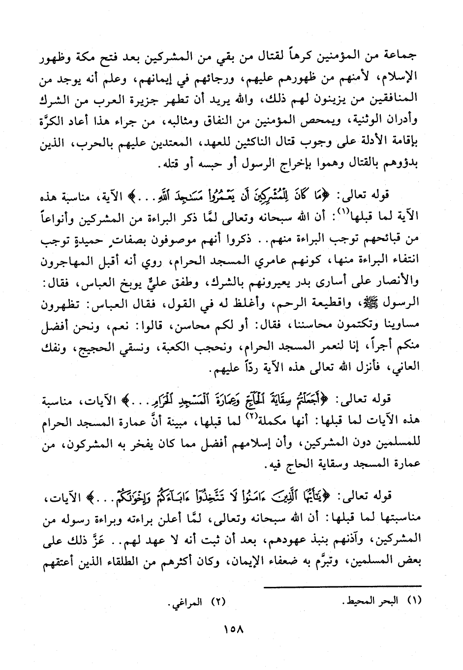 قوله تعالى: {مَا كَانَ لِلْمُشْرِكِينَ أَنْ يَعْمُرُوا مَسَاجِدَ اللَّهِ ...} الآية، مناسبة هذه الآية لما قبلها (¬1): أن الله سبحانه وتعالى لمَّا ذكر البراءة من المشركين وأنواعًا من قبائحهم توجب البراءة منهم .. ذكروا أنهم موصوفون بصفاتٍ حميدةٍ توجب انتفاء البراءة منها، كونهم عامري المسجد الحرام، روي أنه أقبل المهاجرون والأنصار على أسارى بدر يعيرونهم بالشرك، وطفق عليٌّ يوبخ العباس، فقال: الرسول - صلى الله عليه وسلم -، واقطيعة الرحم، وأغلظ له في القول، فقال العباس: تظهرون مساوينا وتكتمون محاسننا، فقال: أو لكم محاسن، قالوا: نعم، ونحن أفضل منكم أجرًا، إنا لنعمر المسجد الحرام، ونحجب الكعبة، ونسقي الحجيج، ونفك العاني، فأنزل الله تعالى هذه الآية ردًّا عليهم.