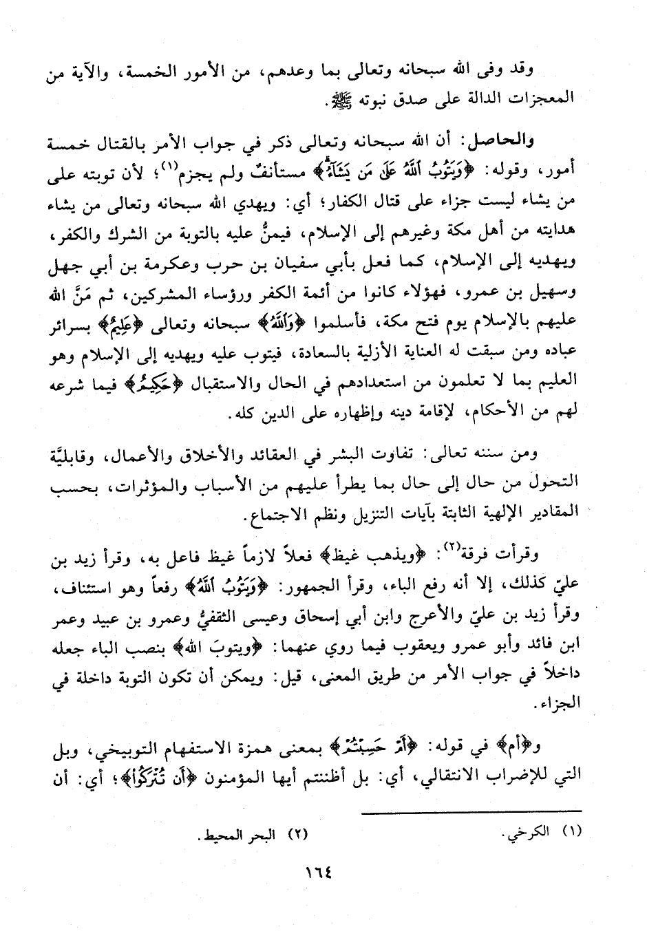 والحاصل: أن الله سبحانه وتعالى ذكر في جواب الأمر بالقتال خمسة أمور، وقوله: {وَيَتُوبُ اللَّهُ عَلَى مَنْ يَشَاءُ} مستأنفٌ ولم يجزم (¬1)؛ لأن توبته على من يشاء ليست جزاء على قتال الكفار؛ أي: ويهدي الله سبحانه وتعالى من يشاء هدايته من أهل مكة وغيرهم إلى الإِسلام، فيمنُّ عليه بالتوبة من الشرك والكفر، ويهديه إلى الإِسلام، كما فعل بأبي سفيان بن حرب وعكرمة بن أبي جهل وسهيل بن عمرو، فهؤلاء كانوا من أئمة الكفر ورؤساء المشركين، ثم مَنَّ الله عليهم بالإِسلام يوم فتح مكة، فأسلموا {وَاللَّهُ} سبحانه وتعالى {عَلِيمٌ} بسرائر عباده ومن سبقت له العناية الأزلية بالسعادة، فيتوب عليه ويهديه إلى الإِسلام وهو العليم بما لا تعلمون من استعدادهم في الحال والاستقبال {حَكِيمٌ} فيما شرعه لهم من الأحكام، لإقامة دينه وإظهاره على الدين كله.